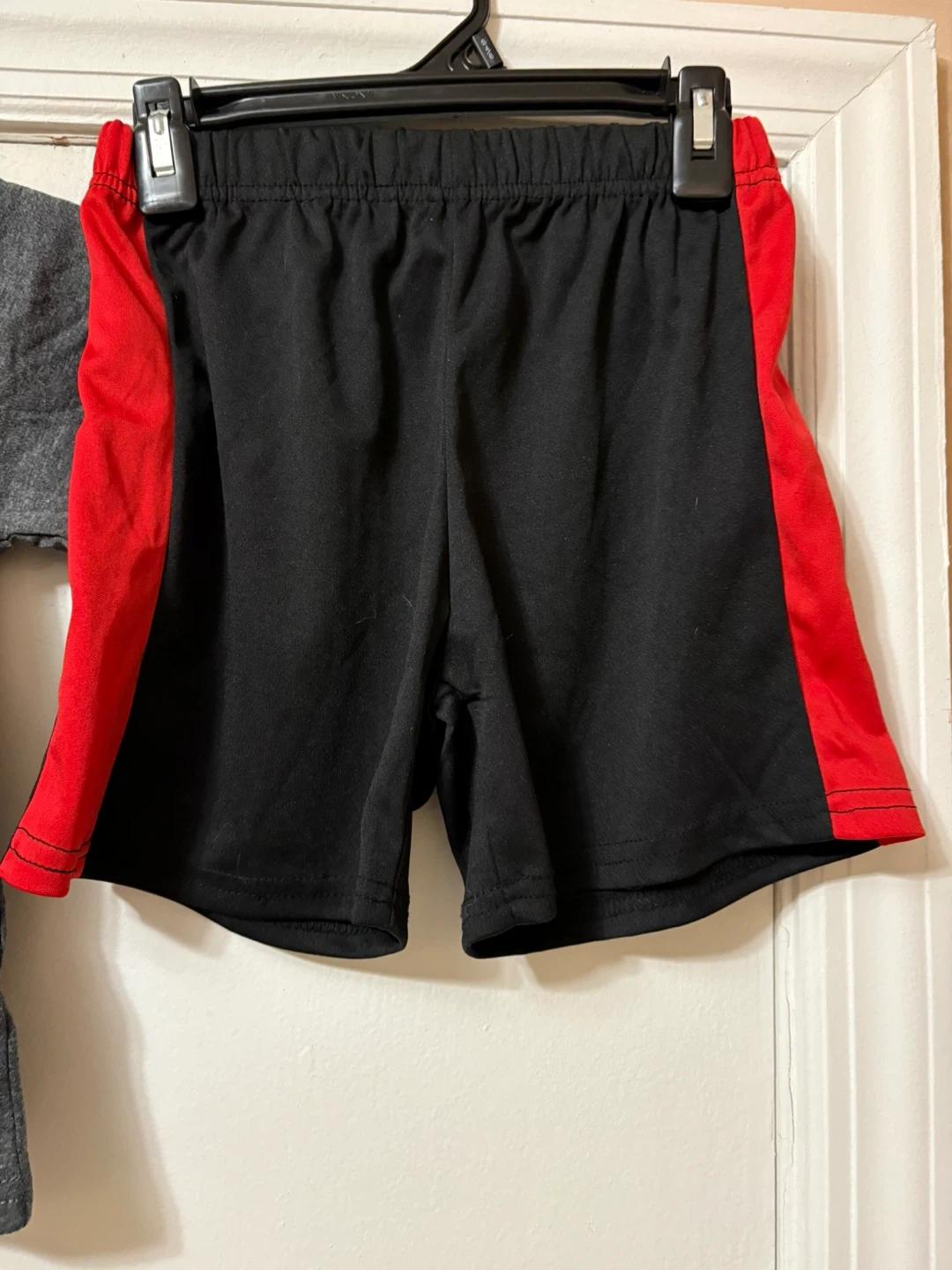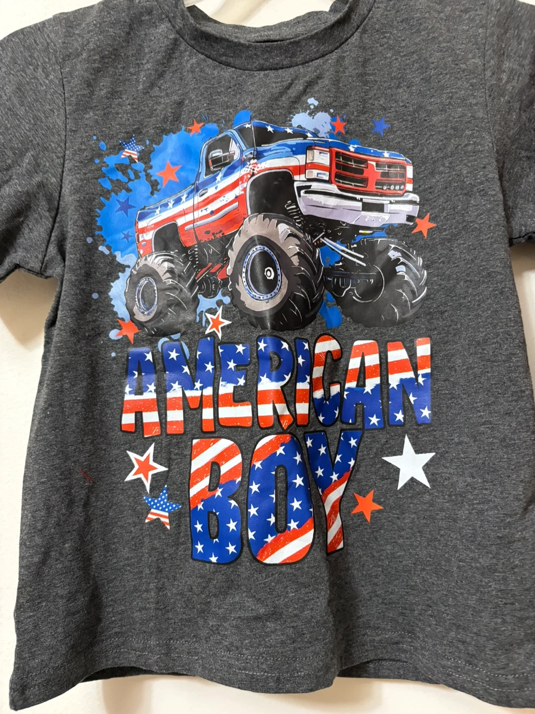 This set includes a charcoal gray t-shirt with a "American Boy" monster truck graphic and black athletic shorts with red side panels. The t-shirt is 100% cotton. The shorts are made of a polyester blend. This outfit is perfect for active play!