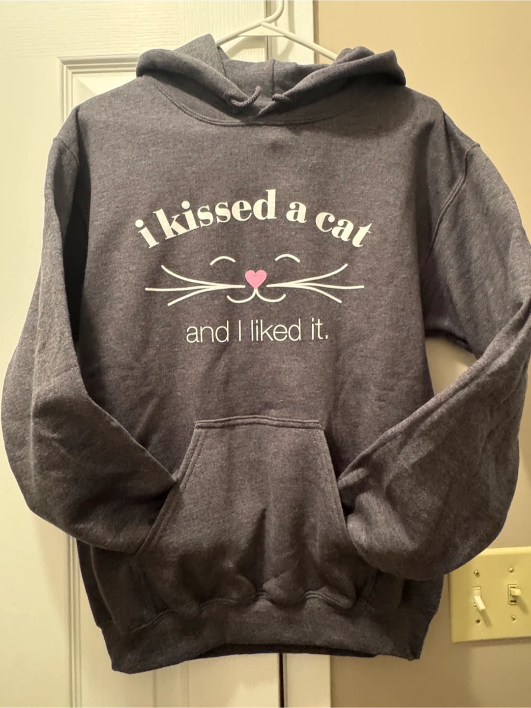 This Gildan Heavy Blend hoodie features a "i kissed a cat and I liked it" graphic. It's a comfortable, dark gray hooded sweatshirt with a front pouch pocket. The material is a heavy blend for warmth.