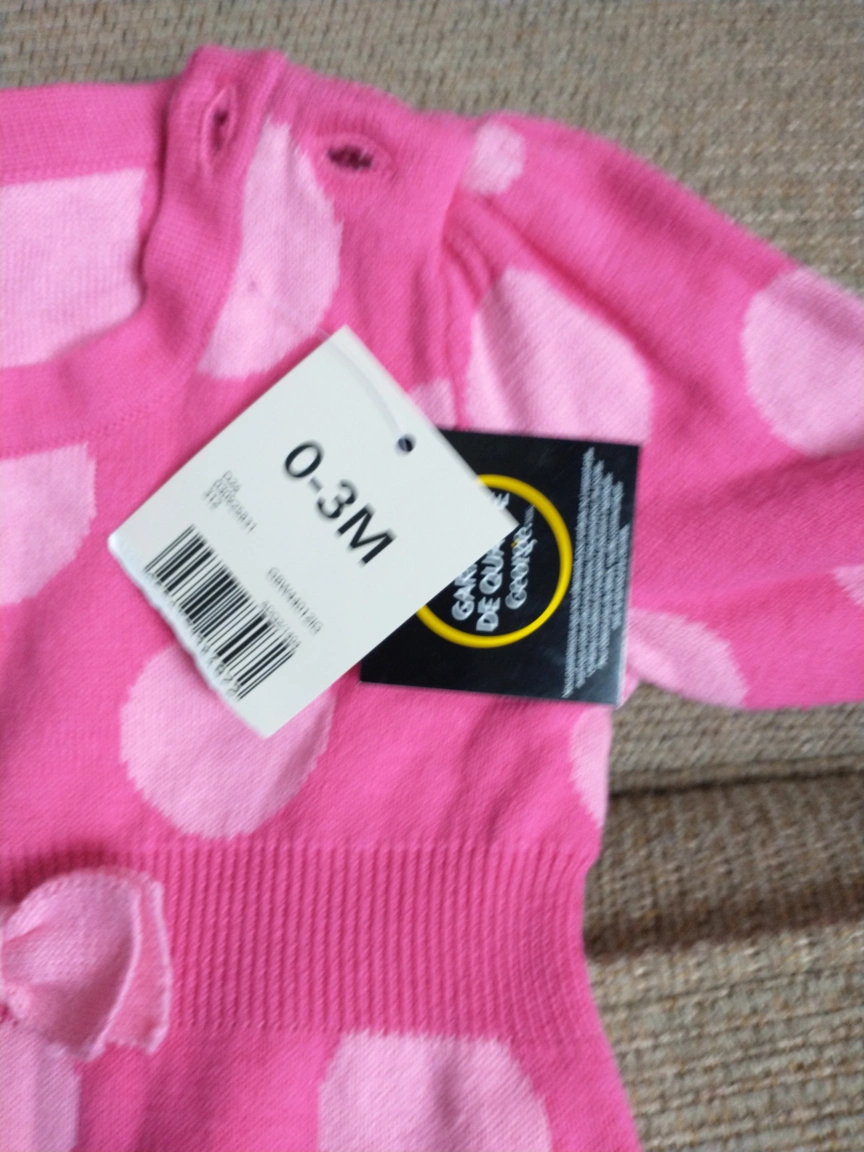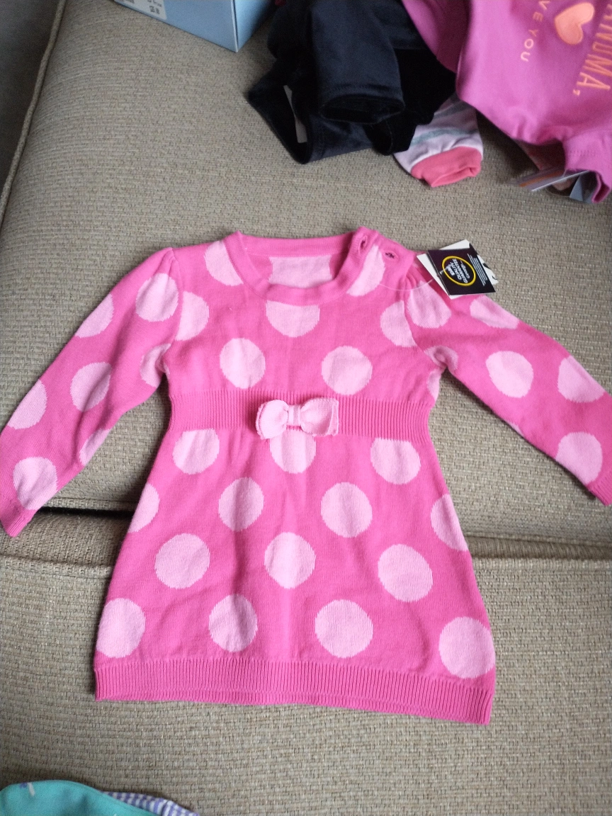 Pink sweater dress with white polka dots and a bow at the waist. Long sleeves. Size 0-3 months.