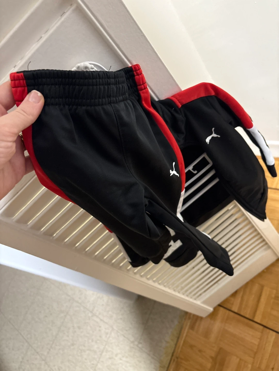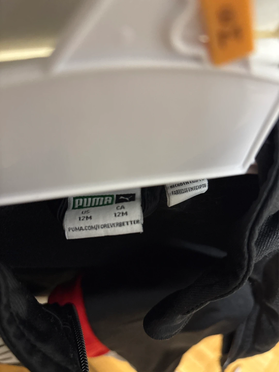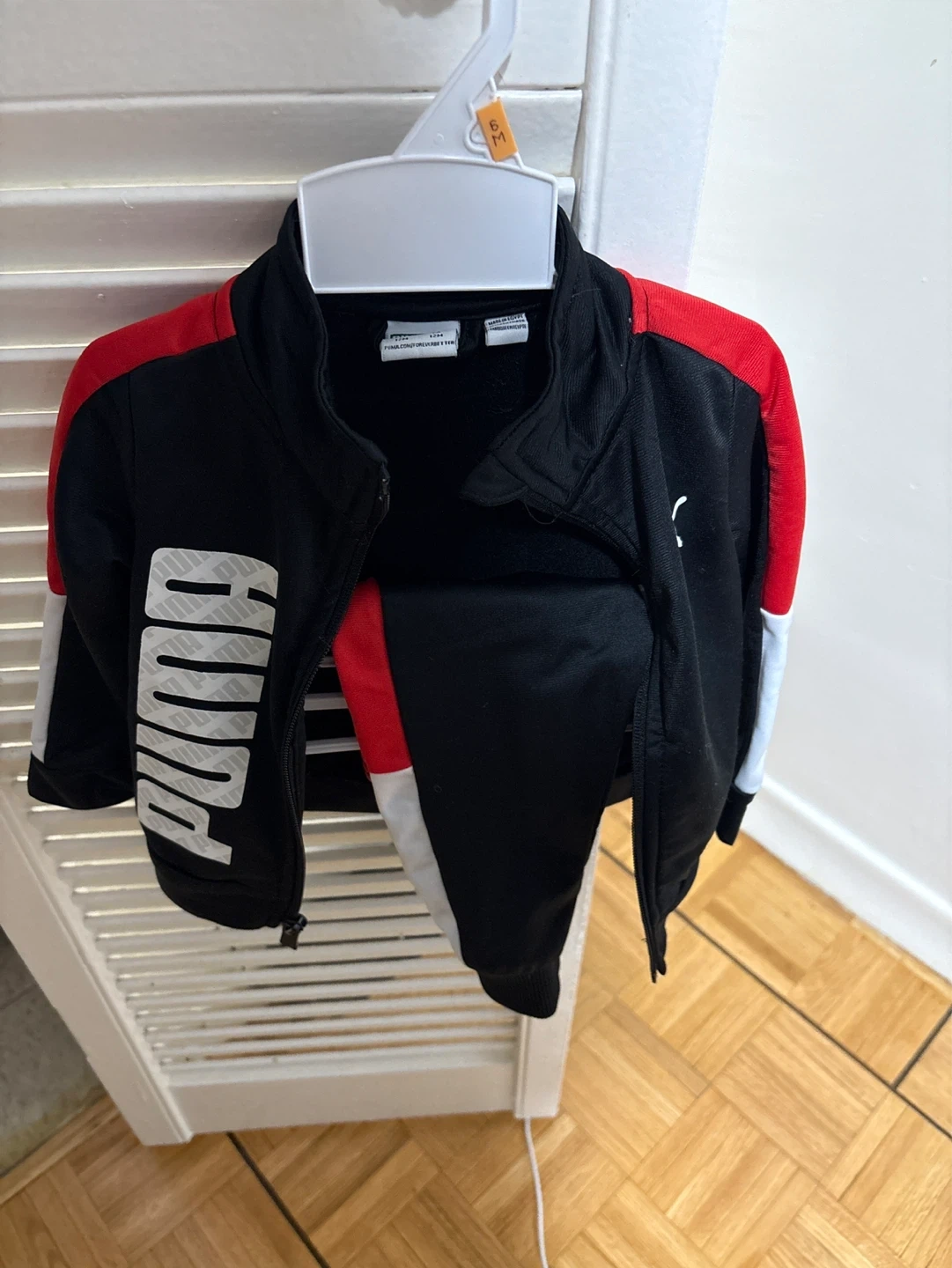 This is a Puma tracksuit set. It's a two-piece outfit for babies. The set includes a jacket and pants. Size is 12 months.