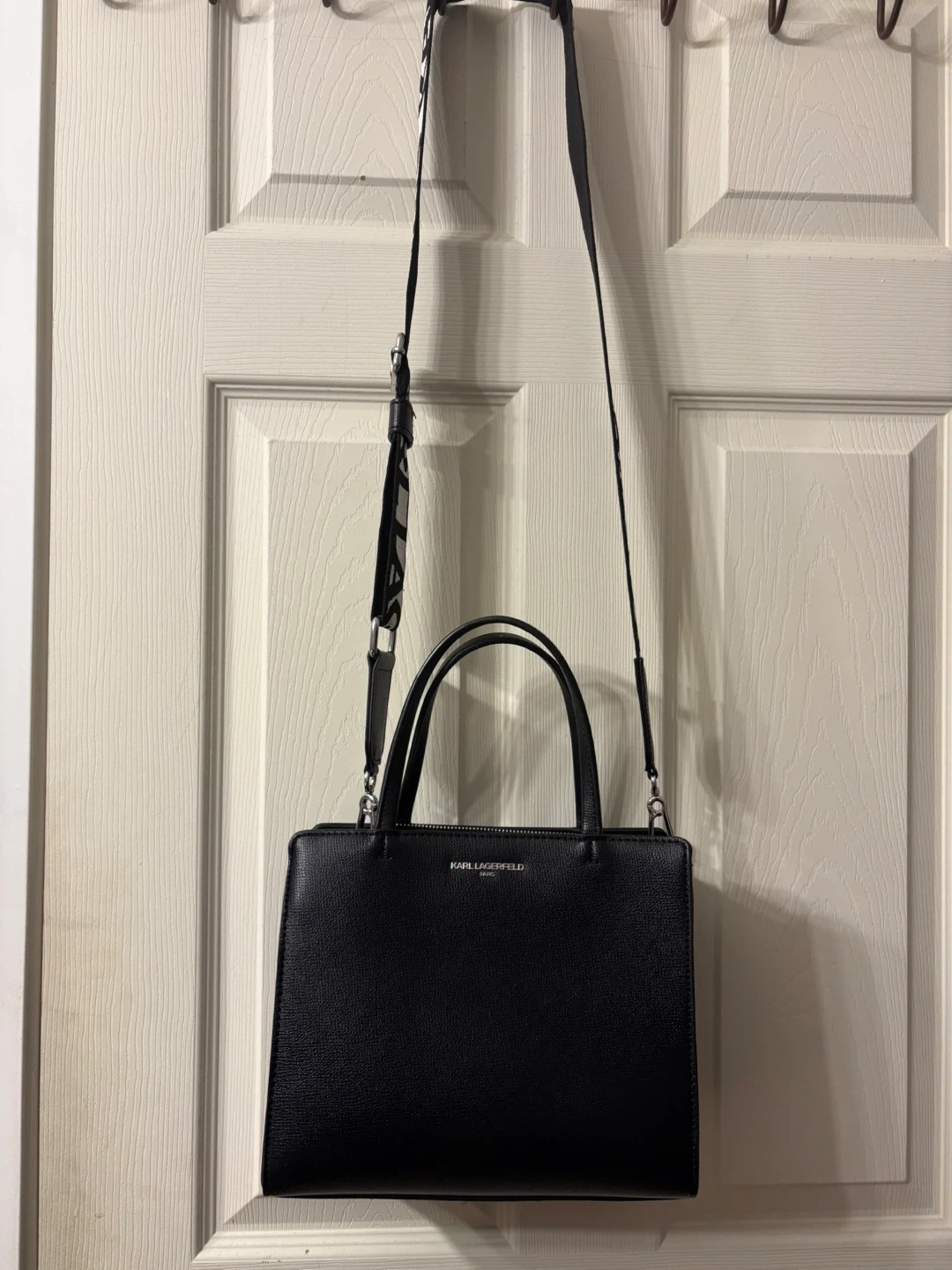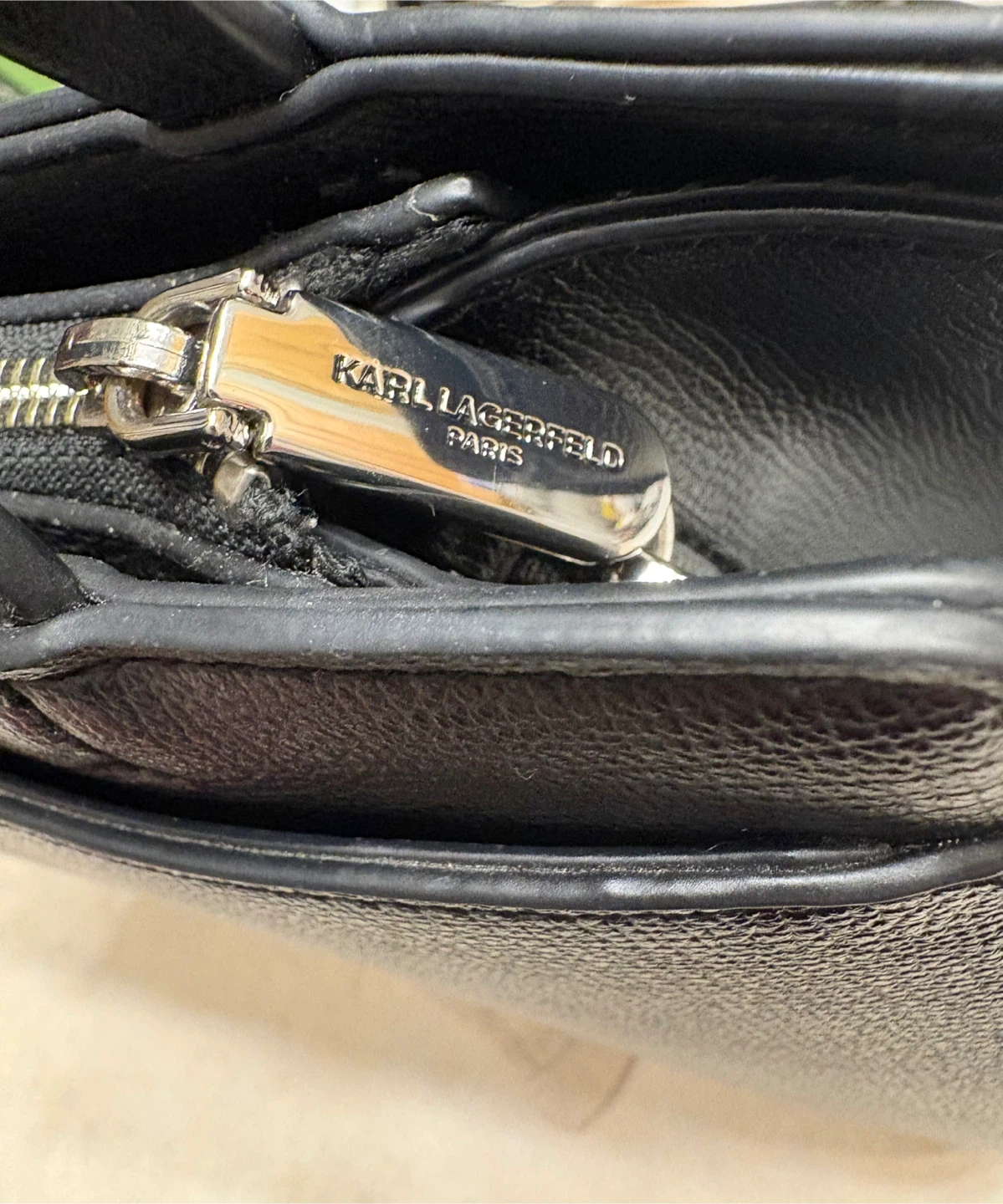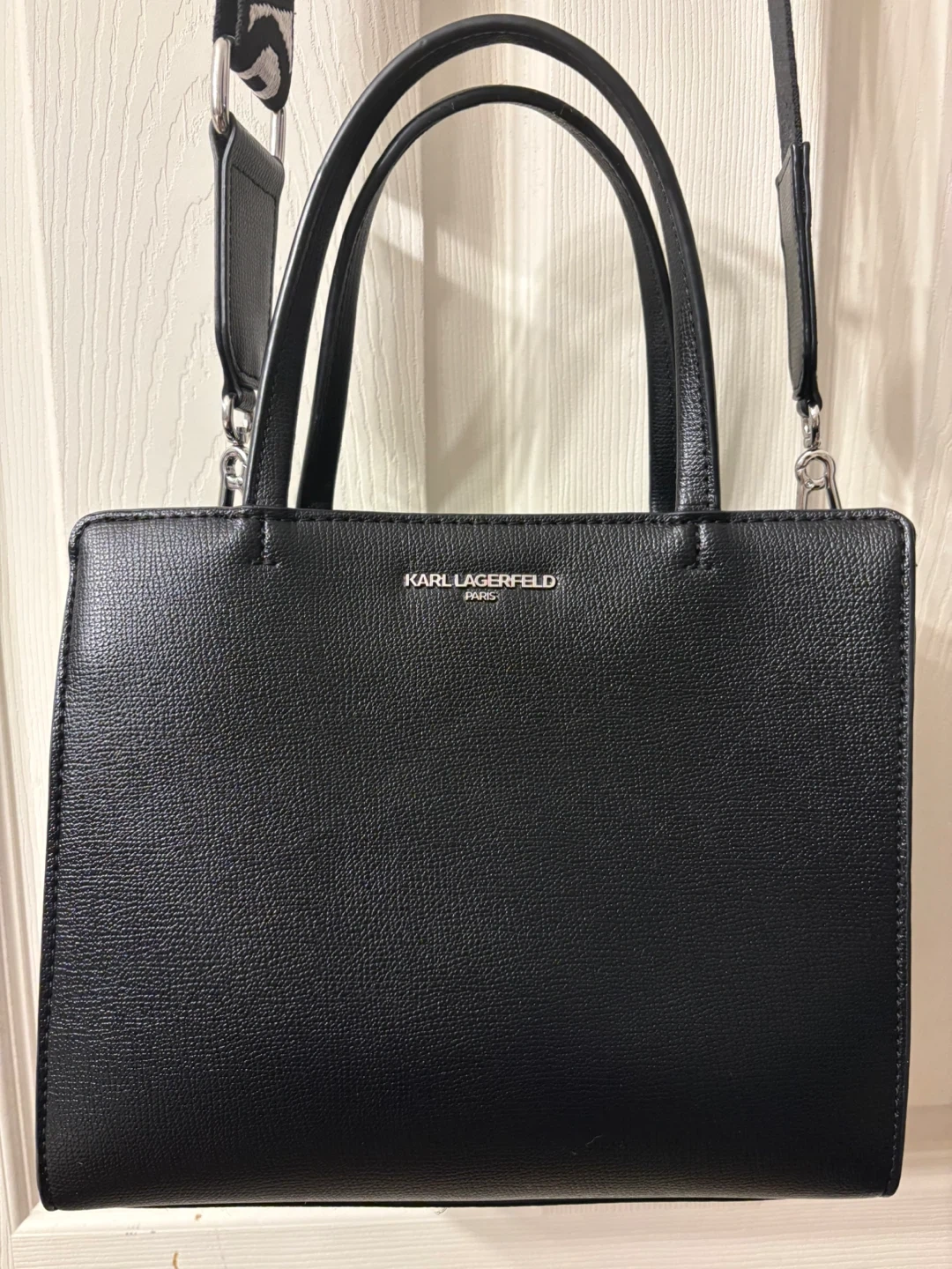 Stylish black shoulder bag by Karl Lagerfeld. It features a pebbled leather exterior and a removable crossbody strap. This bag is perfect for everyday use or for carrying your essentials in style! Great condition, pick up in Chestermere.