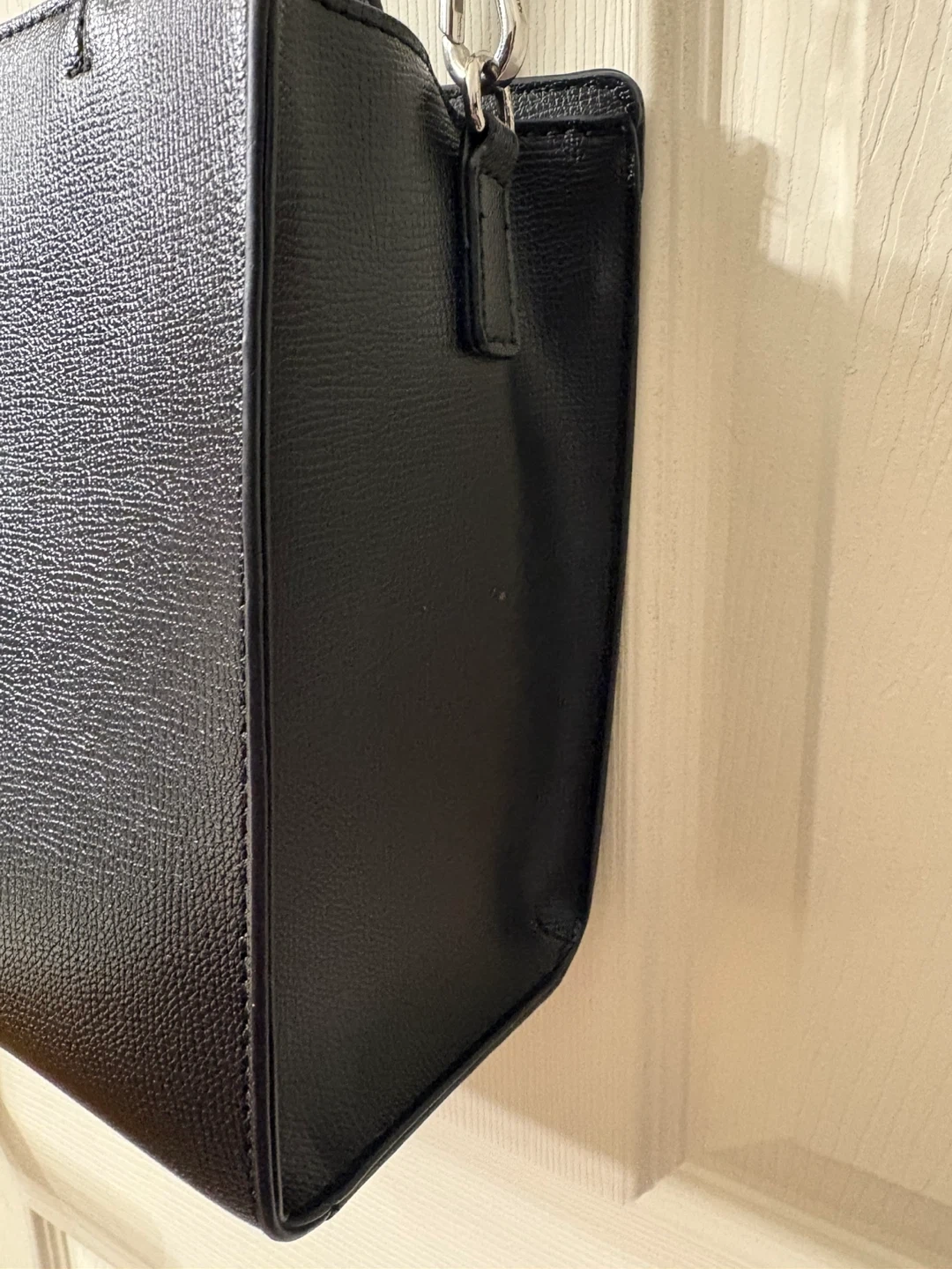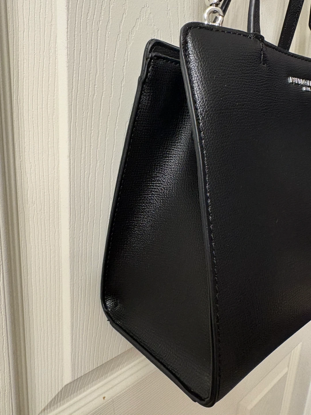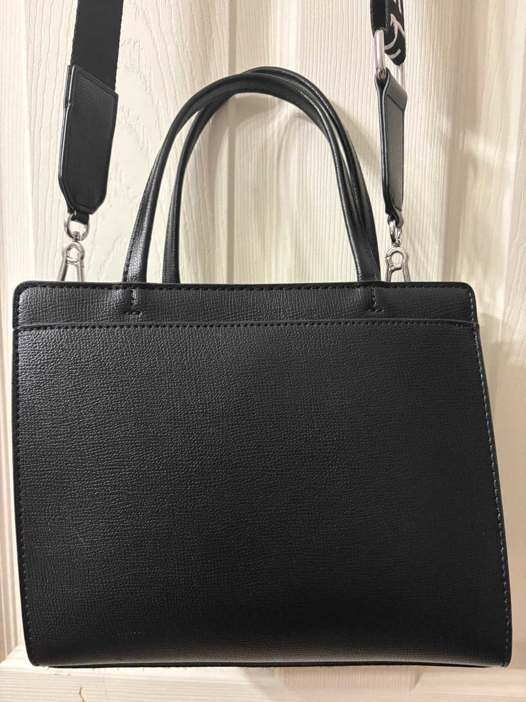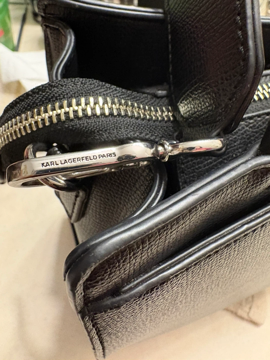 Stylish black shoulder bag by Karl Lagerfeld. It features a pebbled leather exterior and a removable crossbody strap. This bag is perfect for everyday use or for carrying your essentials in style! Great condition, pick up in Chestermere.