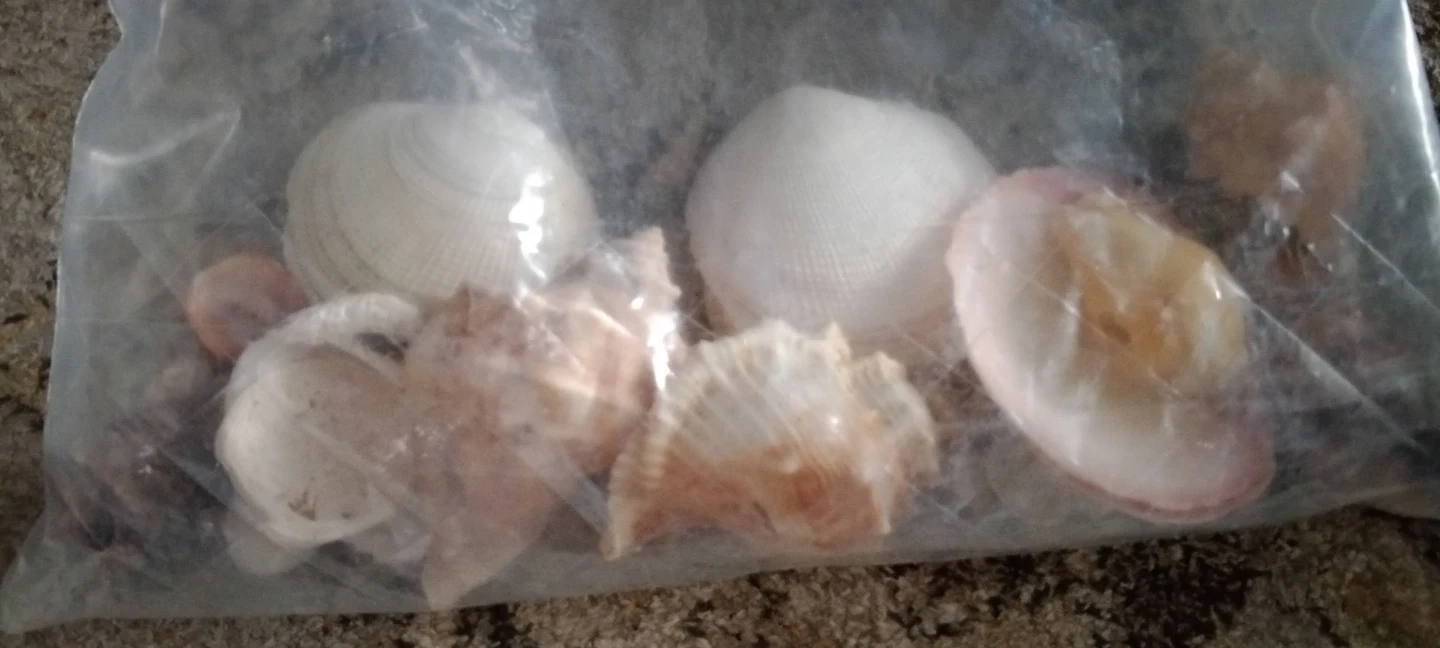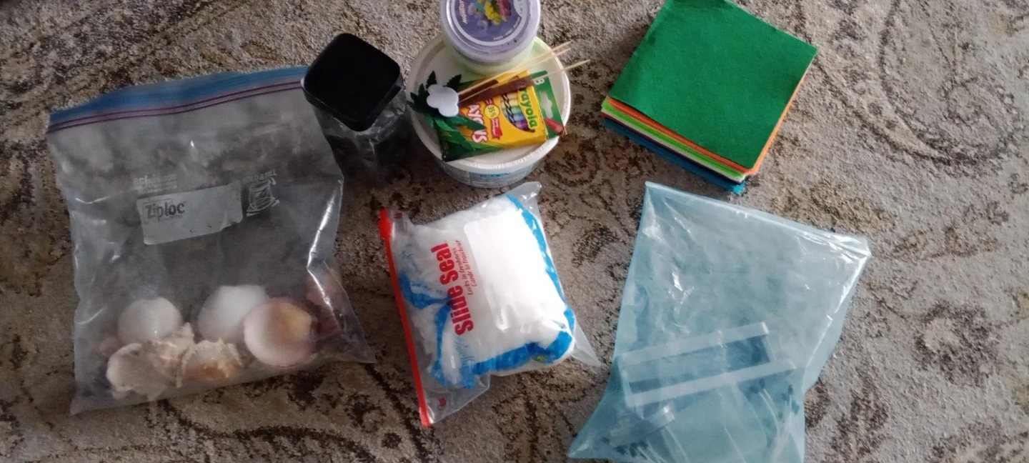 Crafting bundle includes a variety of seashells, a package of Slide Seal 'Artificial Snow', and a stack of colourful felt sheets. Also contains miscellaneous craft supplies like popsicle sticks and a small container. Great for various DIY projects!