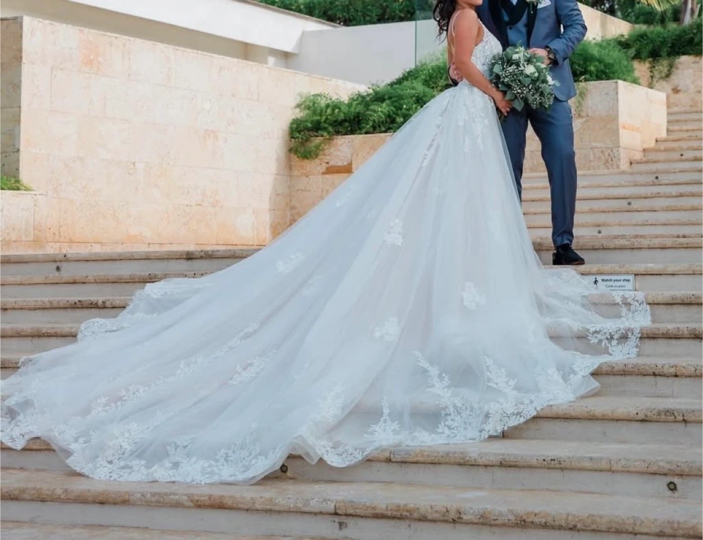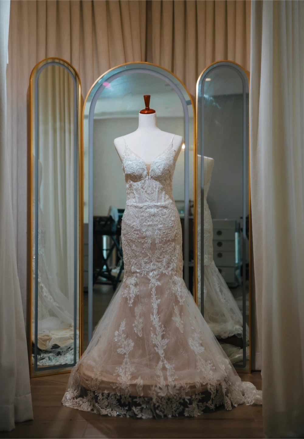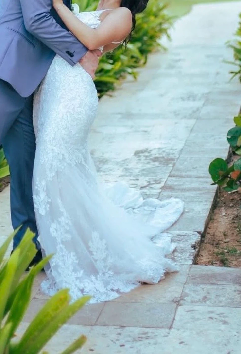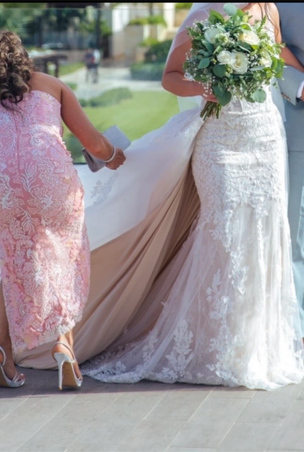 2 in 1 lace mermaid wedding dress with a sweetheart neckline and a dramatic train. Intricate floral lace detailing throughout. Lace-trimmed hem. Fully lined. (detachable over skirt)