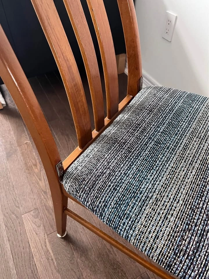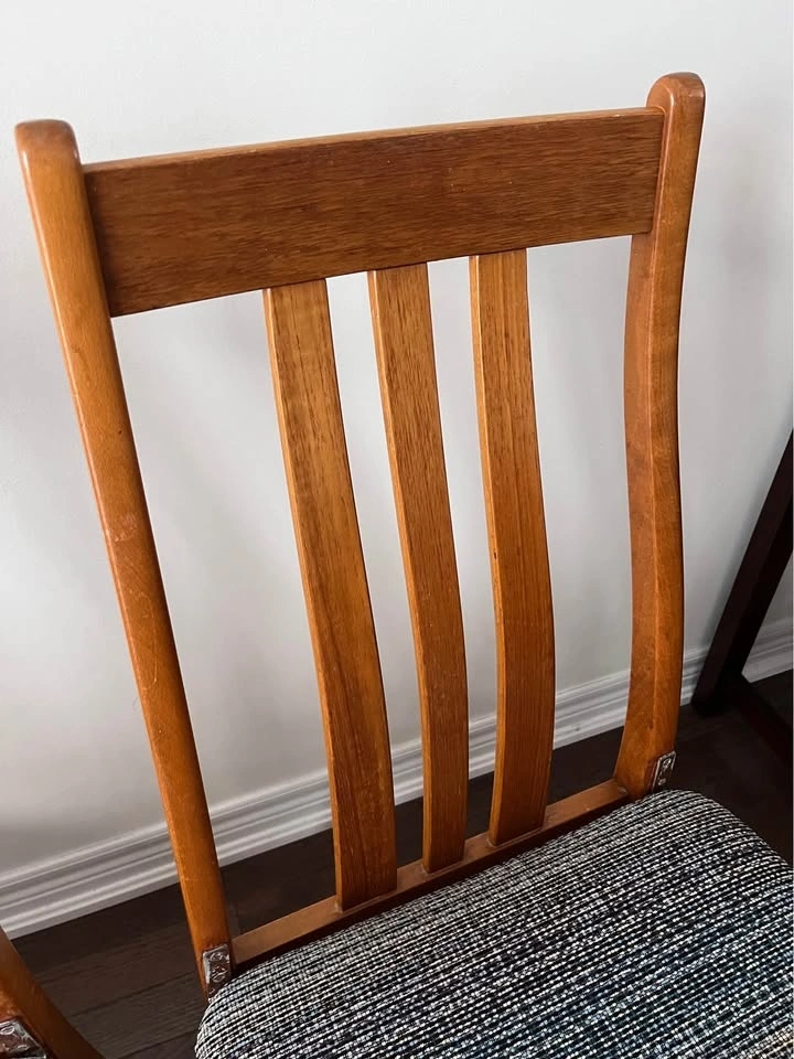 Set of 5 vintage Danish dining chairs by Farstrup. Features a nice curved back and teak and beech frame. Nicely padded seats, newly reupholstered in textured fabric. Metal brackets have been added, which is reflected in the price. Otherwise, in good vintage condition. Chairs are sturdy.