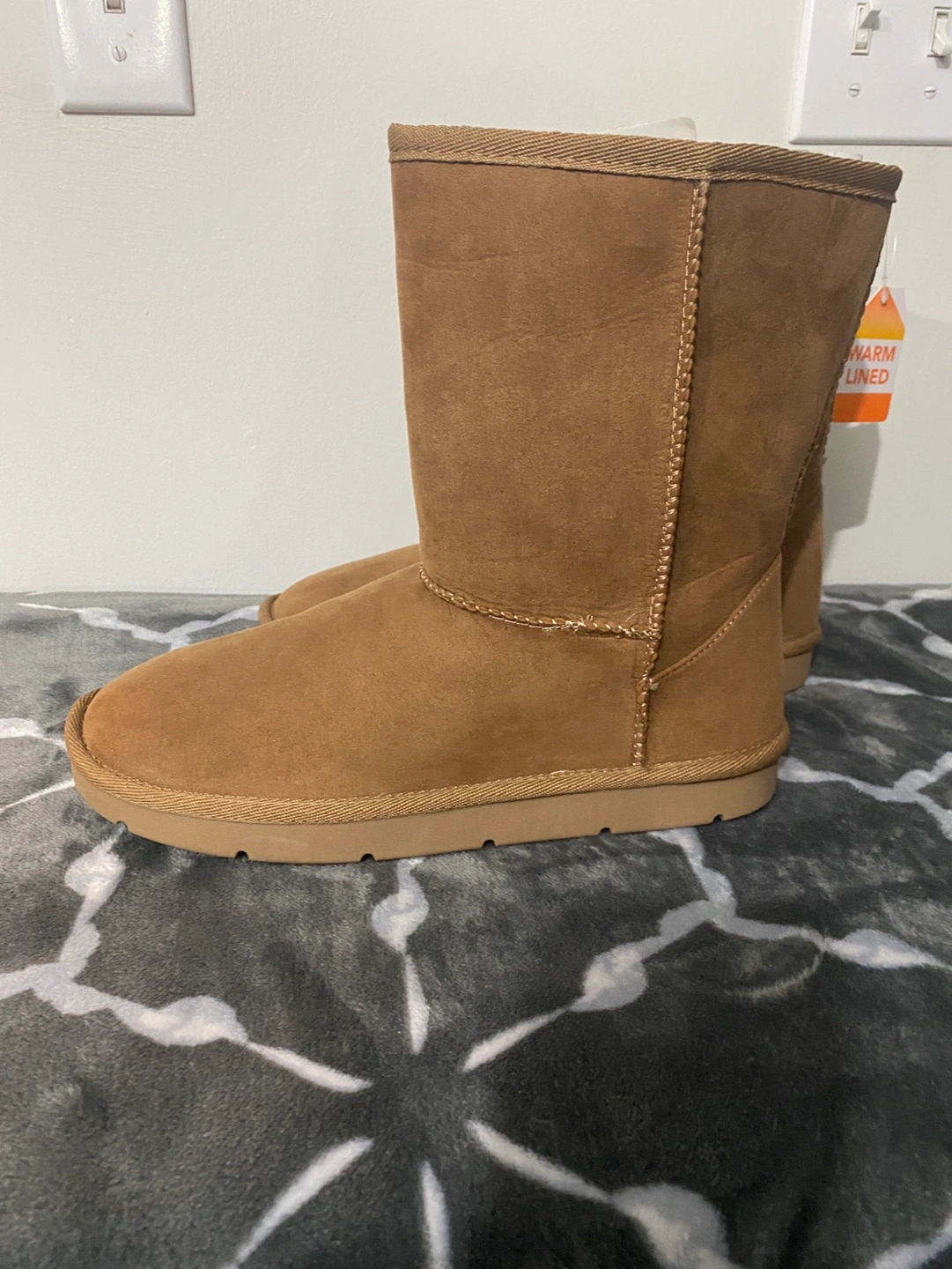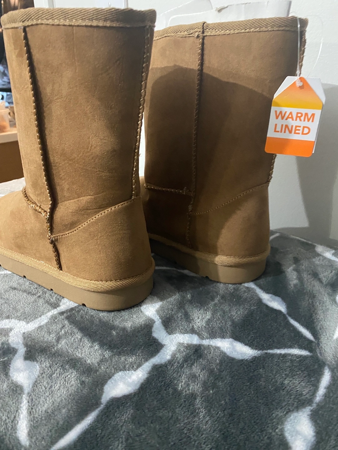 Women's warm lined winter boots. Brown suede-like material. Lightweight sole. Great for cold weather.
