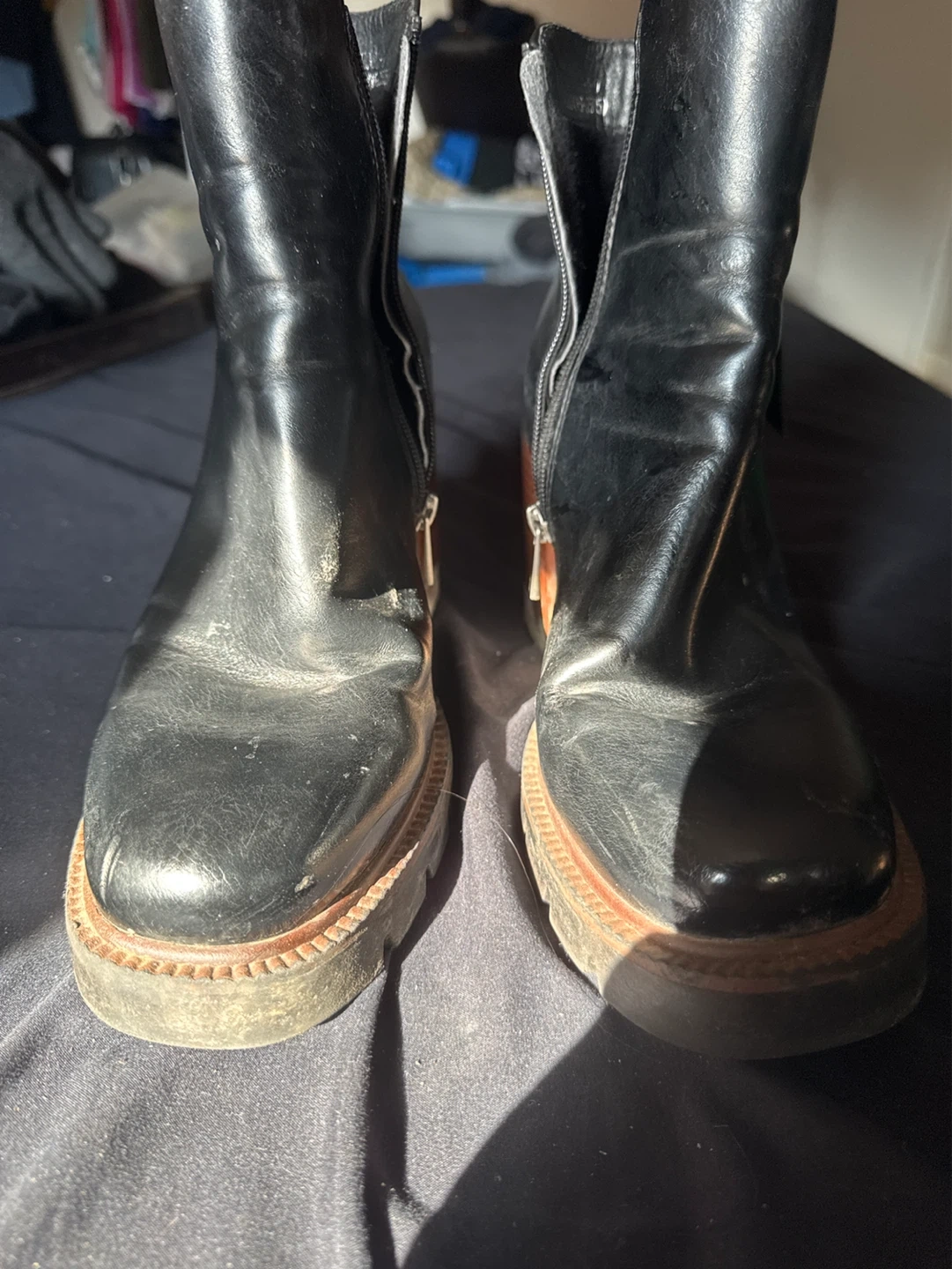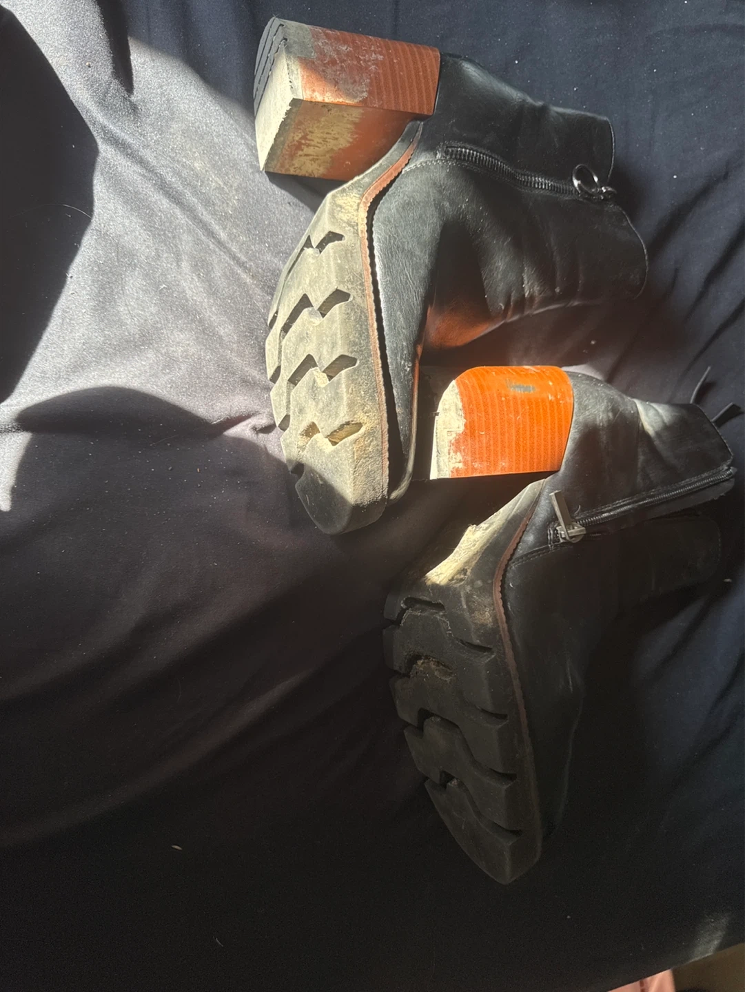 Black leather ankle boots with a chunky block heel and side zippers. They feature a durable lug sole for good traction. These boots are great for everyday wear.