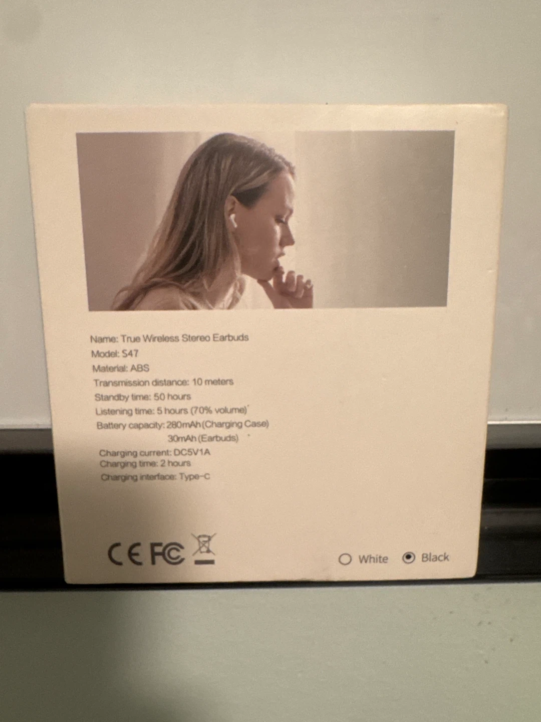 Selling a brand new pair of S47 True Wireless Stereo Earbuds! They come in the original box and include the earbuds themselves, a charging case, and a Type-C charging cable.