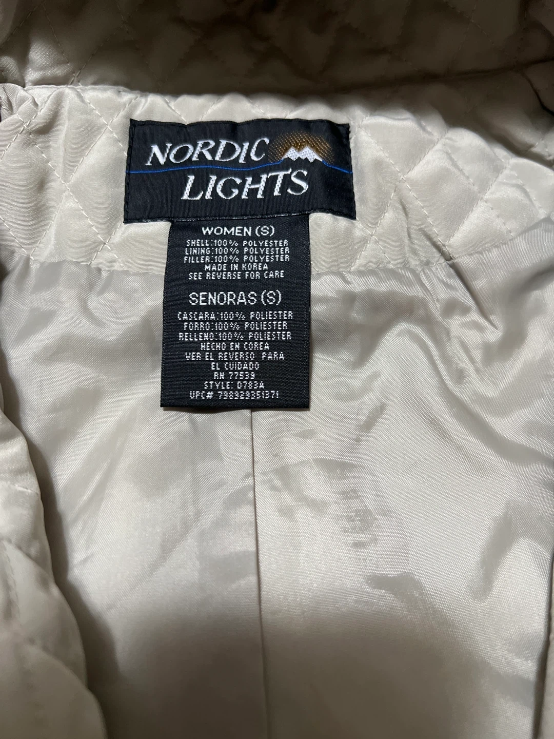 Selling a Nordic Lights quilted hooded coat in size small. It's in great condition and perfect for layering! The shell and lining are both 100% polyester.
