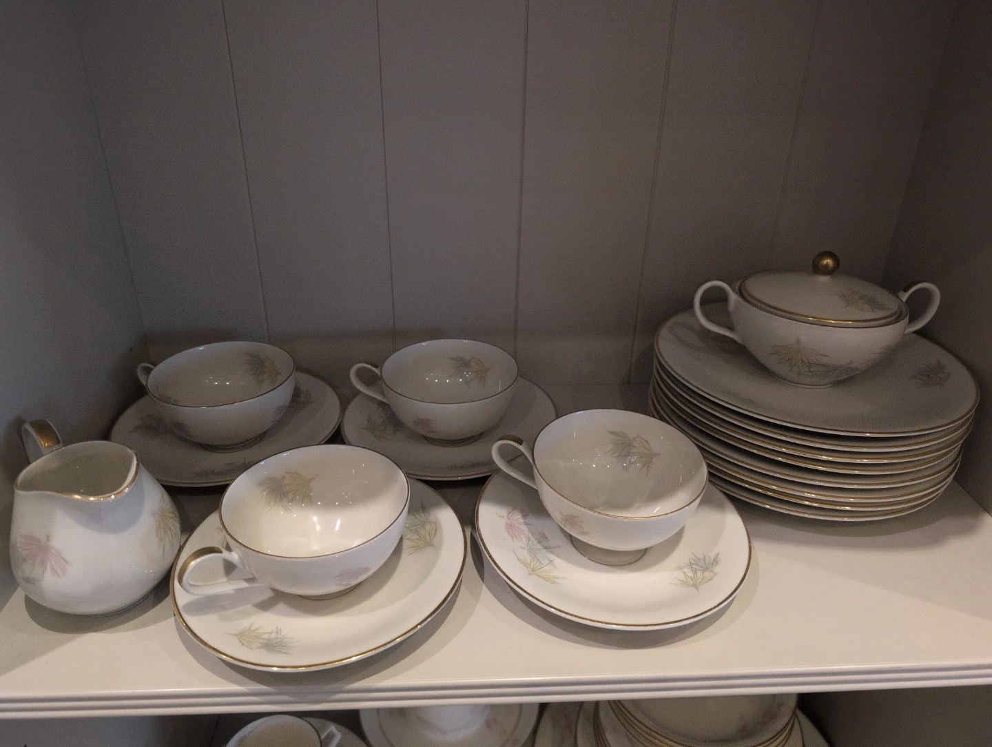 Set of fine porcelain tea cups and saucers with a delicate floral design. It includes a sugar bowl with lid and a creamer pitcher. Gold trim accents the rims and handles.