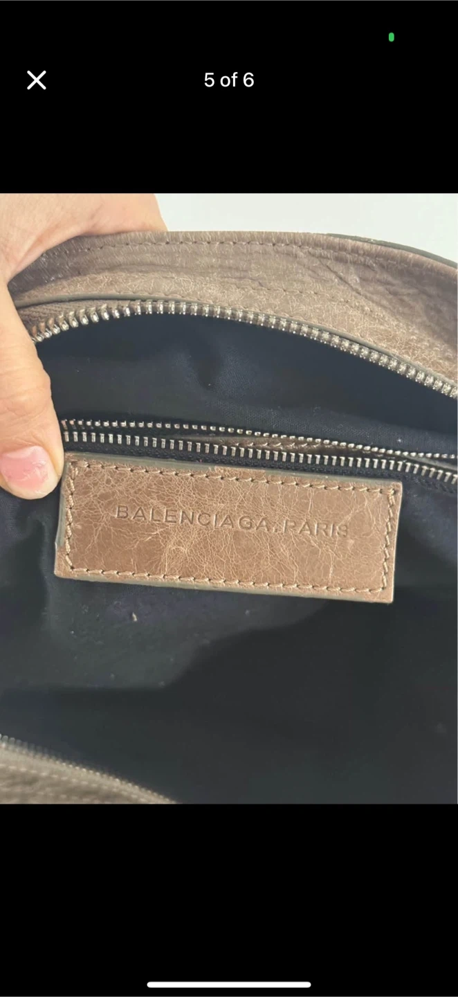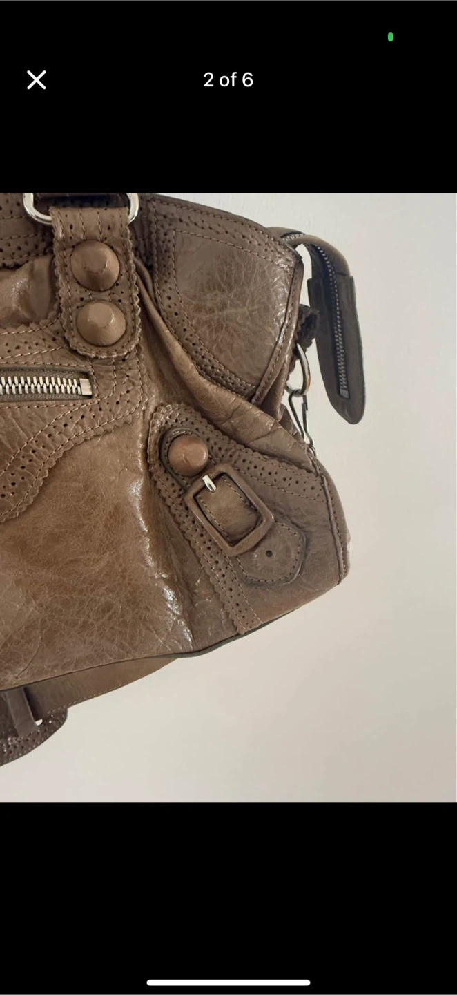 Taupe distressed leather Balenciaga Paris handbag. Features double top handles and a removable shoulder strap. Minor flaw on the edge and one of the zippers is missing tab but not noticeable