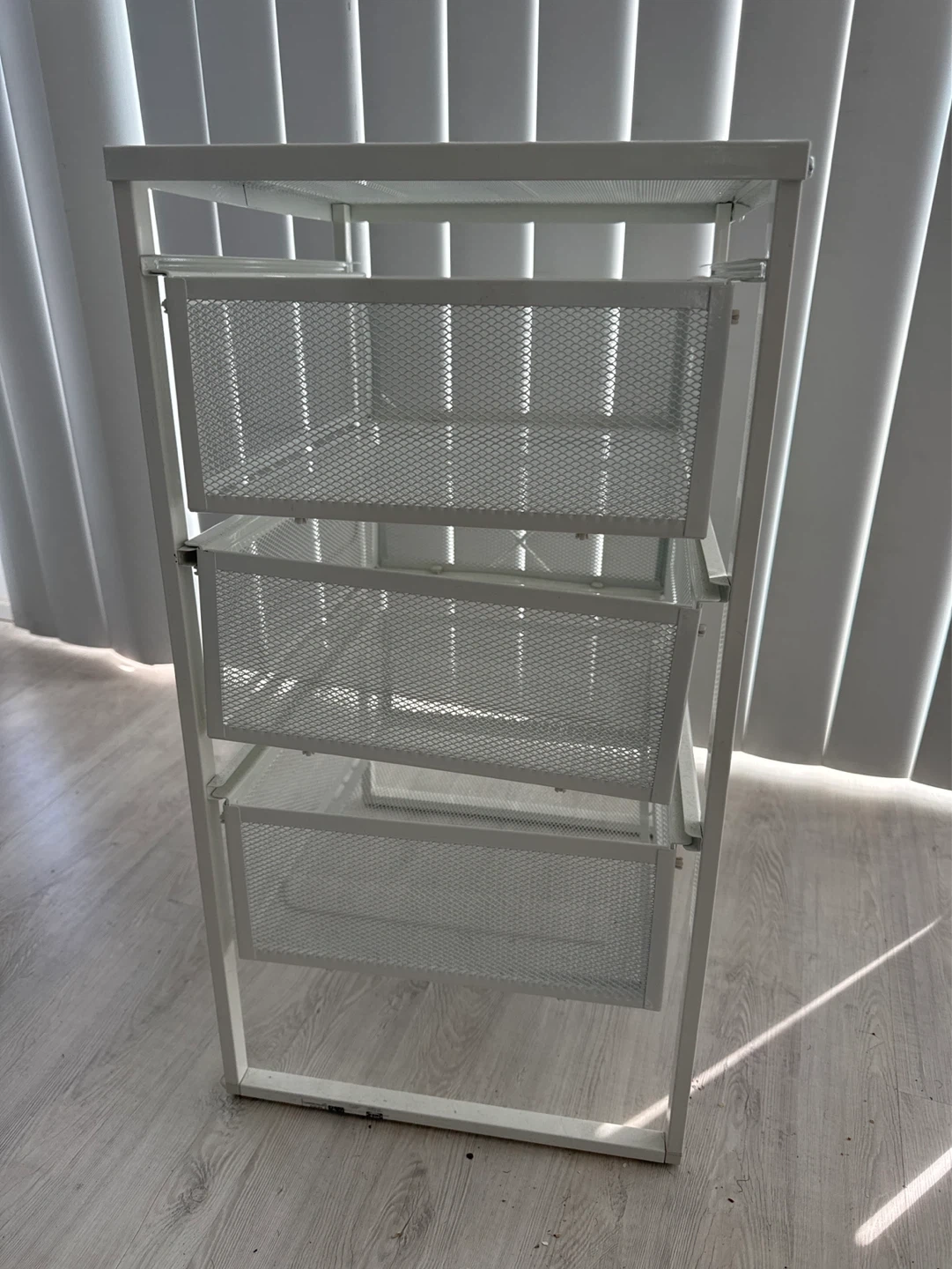White IKEA LENNART drawer unit. Features three mesh drawers for storage. Metal construction.