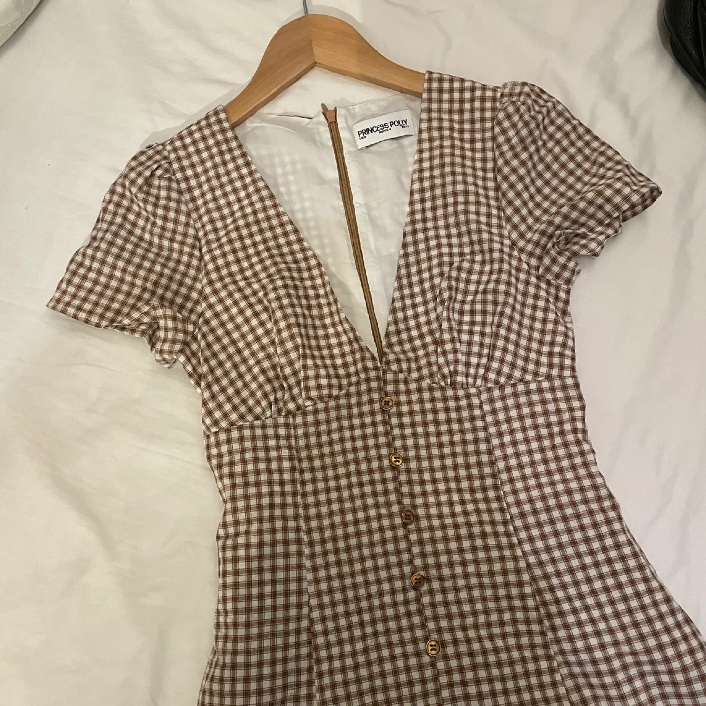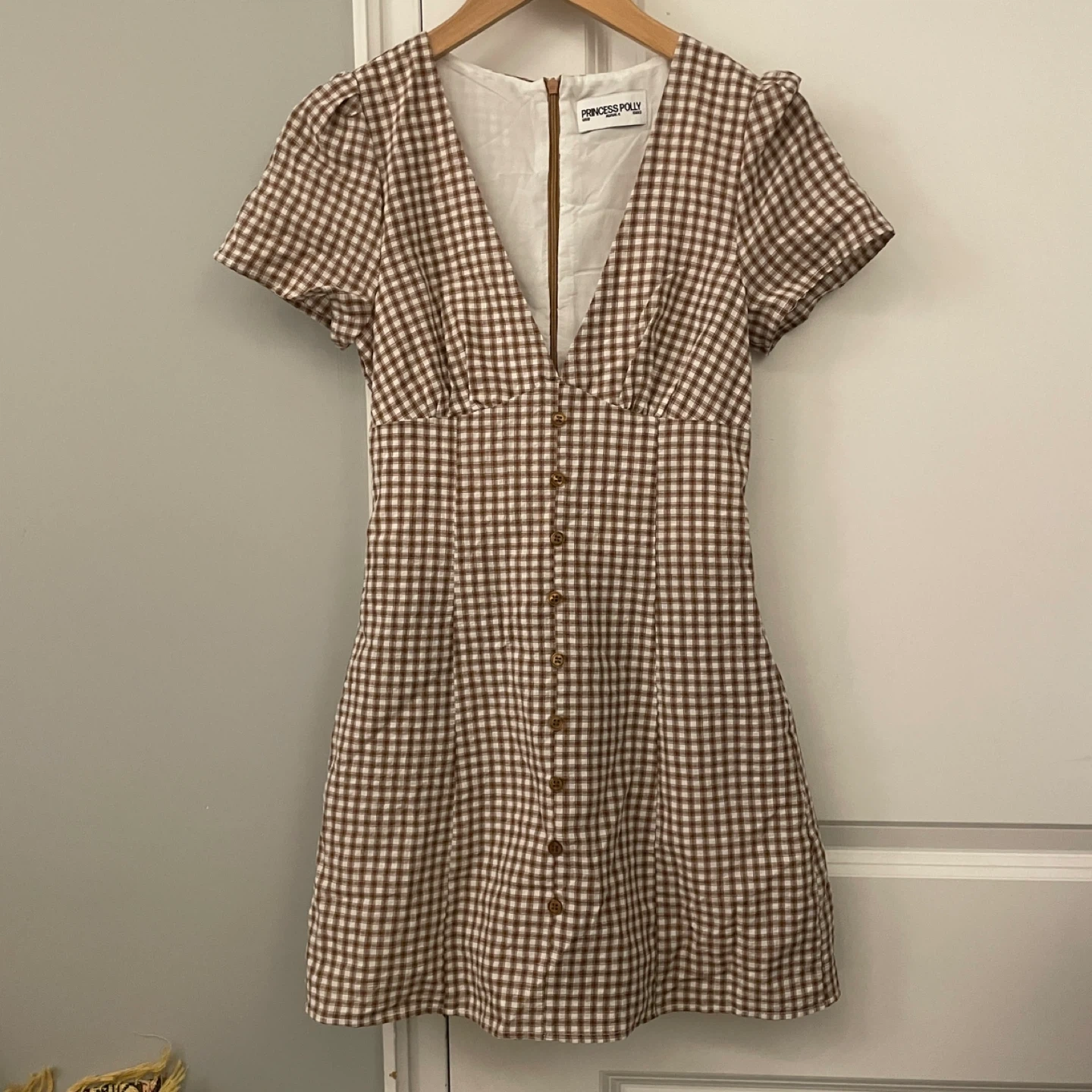 Princess Polly short-sleeve mini dress in a brown and white gingham pattern.