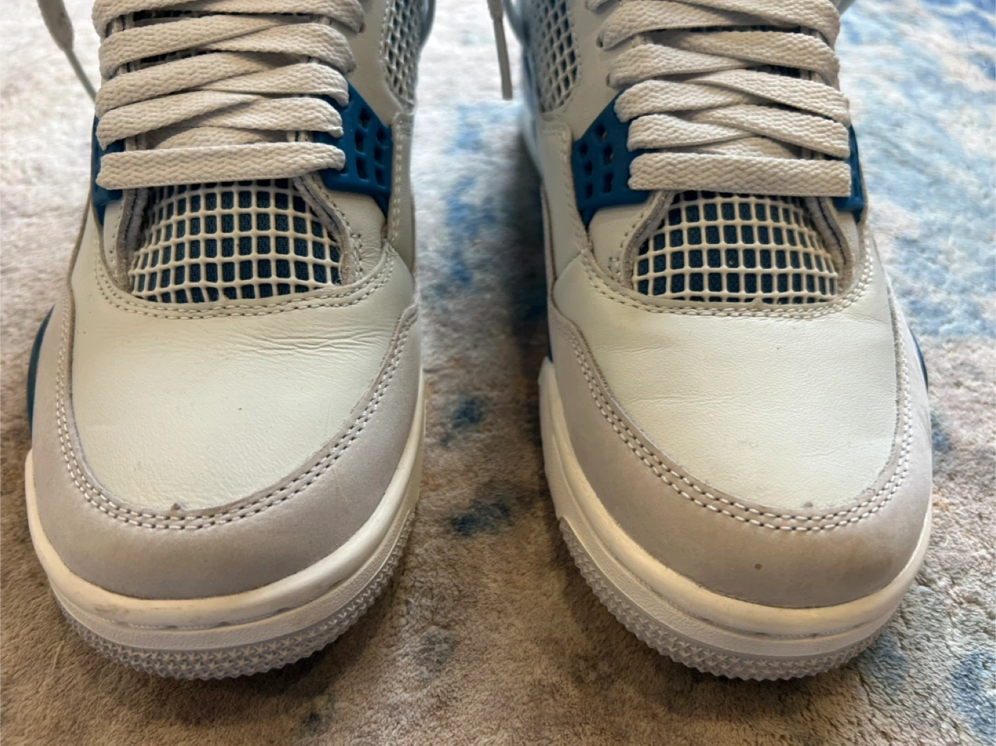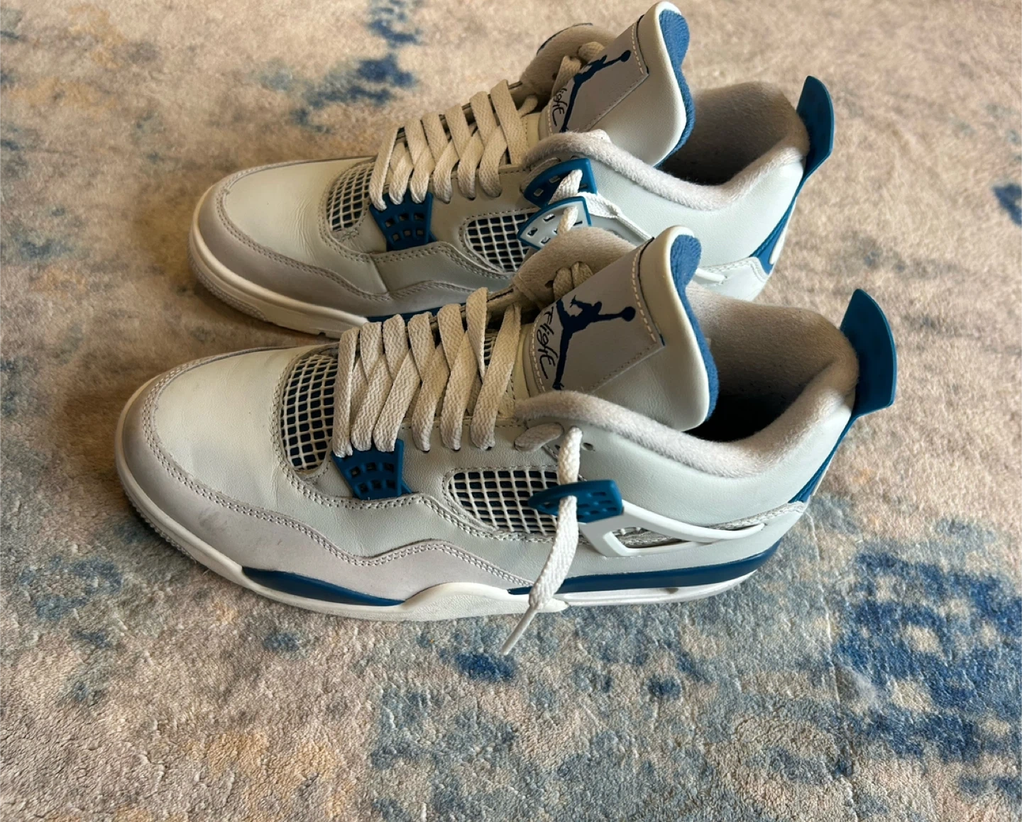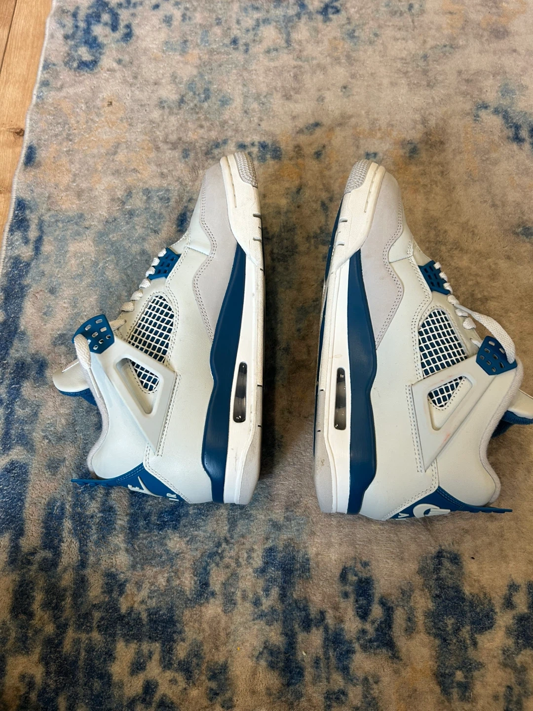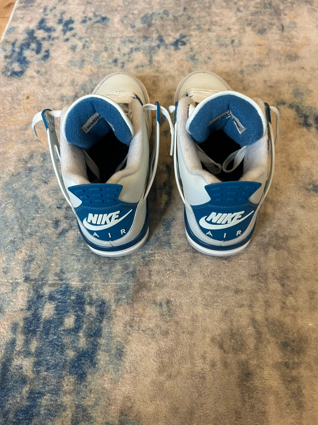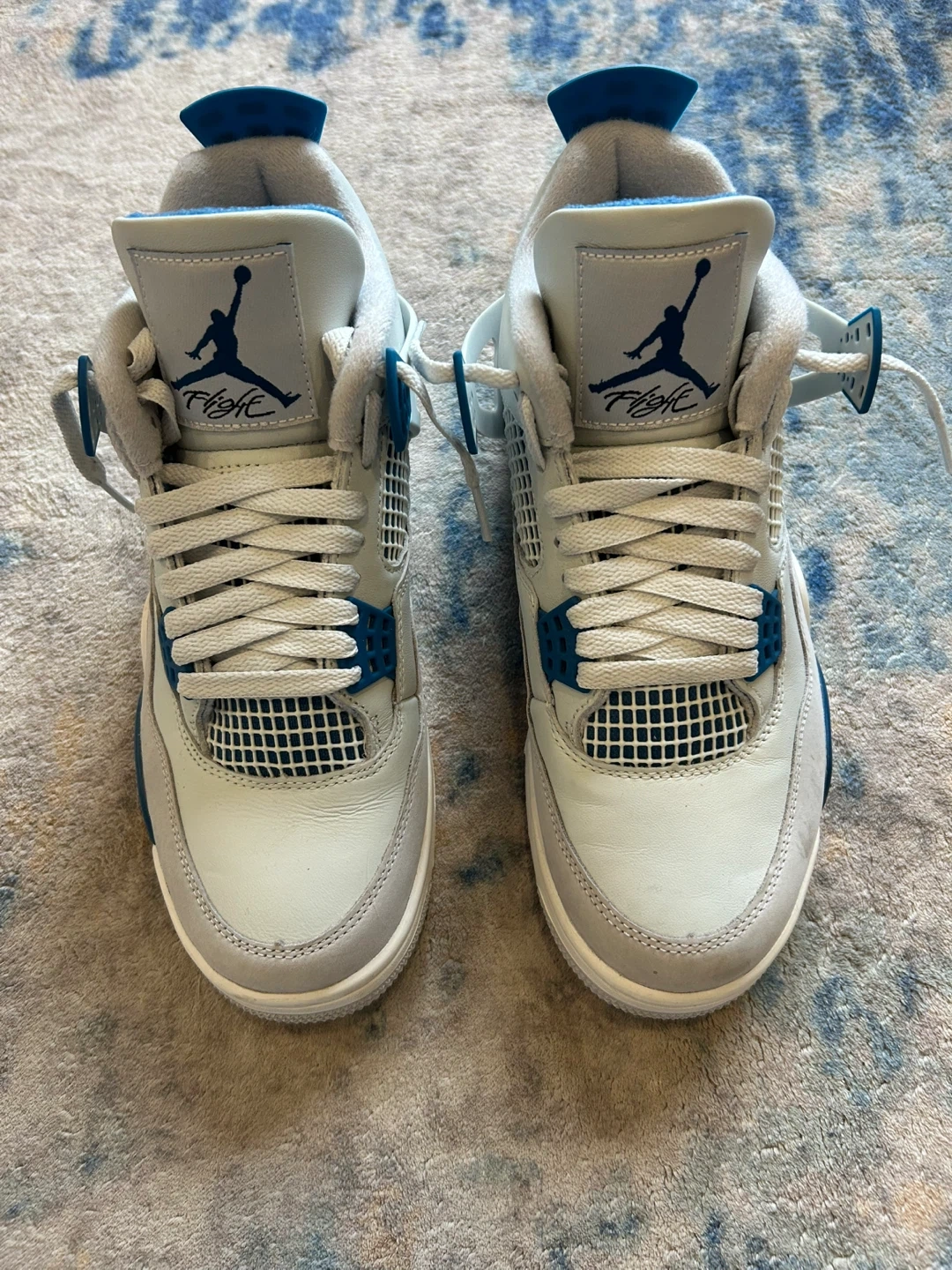 These Air Jordan 4 Retro sneakers come in a clean white and racer blue colourway. They feature the iconic Jumpman logo and Flight text on the tongue. Leather and mesh upper with rubber sole.