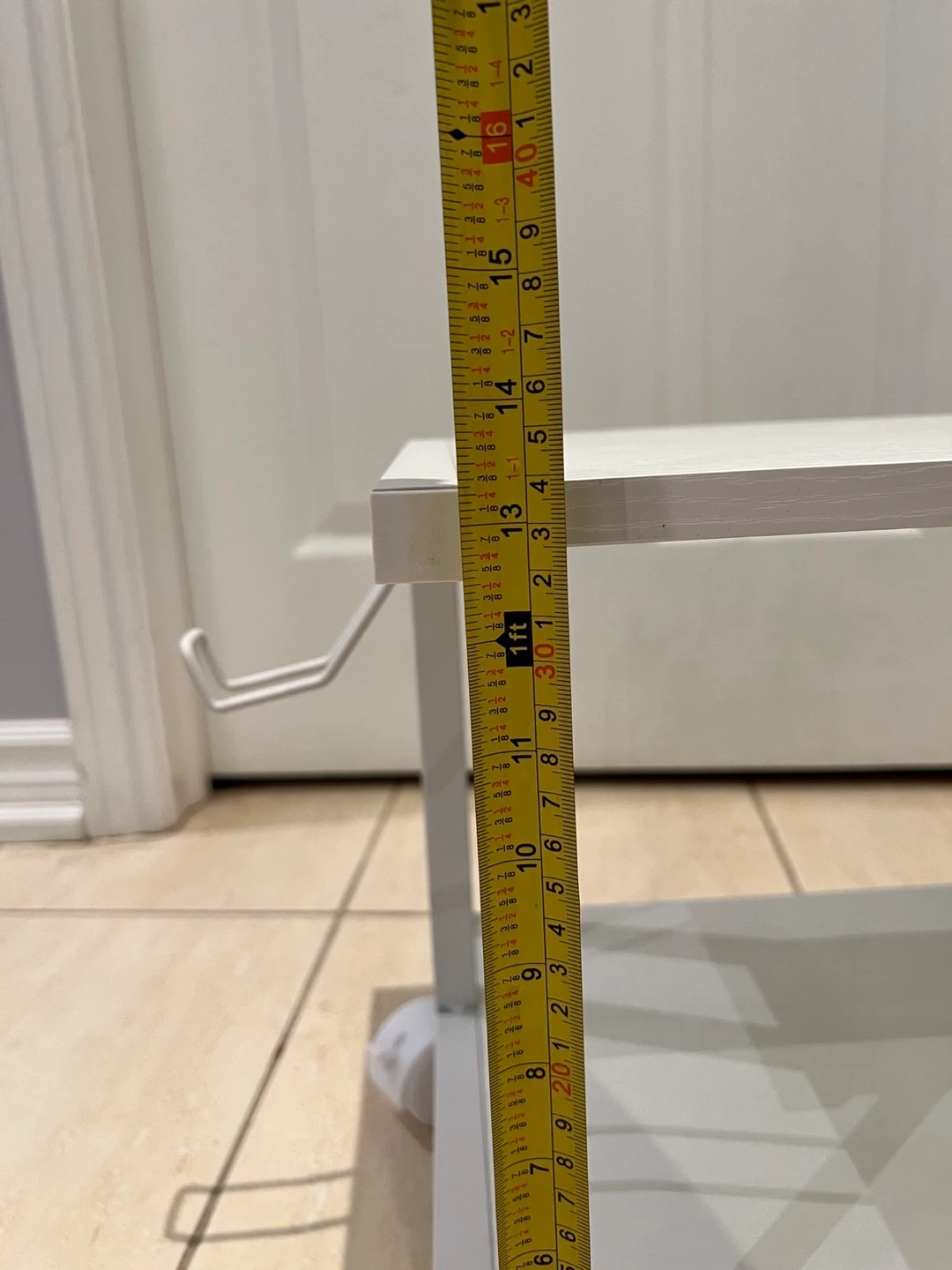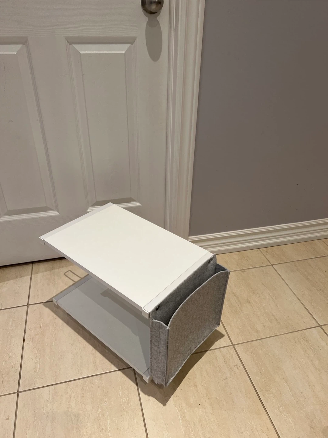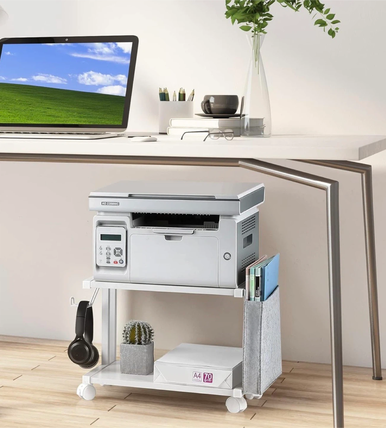 A handy white 2-tier rolling cart with a grey felt storage bag attached. It's perfect for organizing office supplies or small electronics. The cart features wheels for easy mobility.