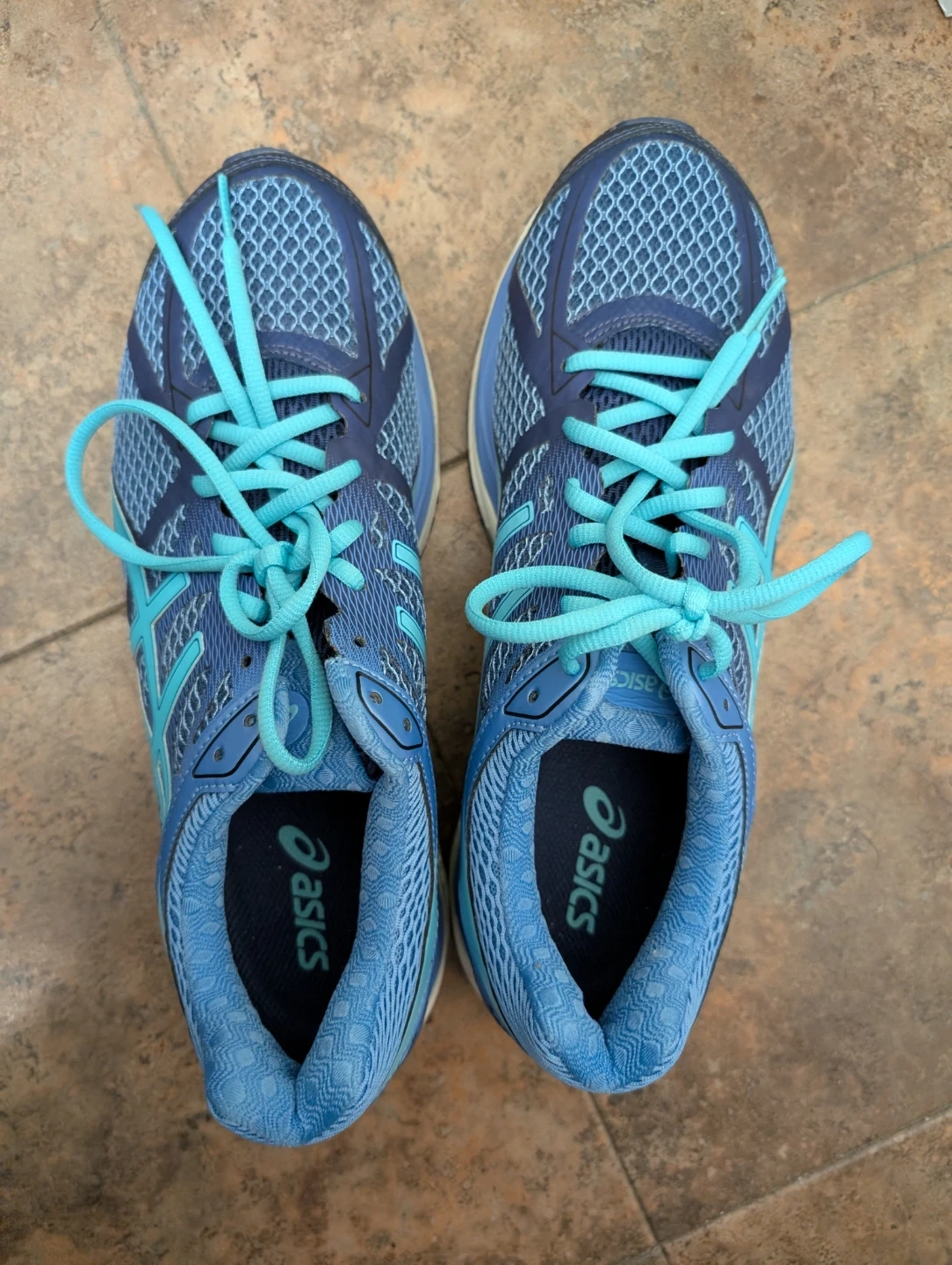 Blue Asics running shoes. US size 11, Euro size 43.5. Made with synthetic fiber and rubber sole. These are great for any kind of running!