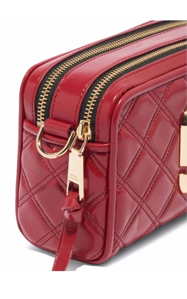 Dark red lambskin with an adjustable, detachable shoulder strap. Features two zip-fastening compartments and a slip pocket to the rear. Gold tone hardware. Dimensions: 21cm x 15cm x 9cm. Used only a couple of times, it's like new. Includes the original dust bag.