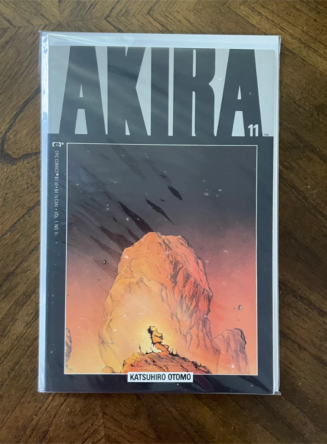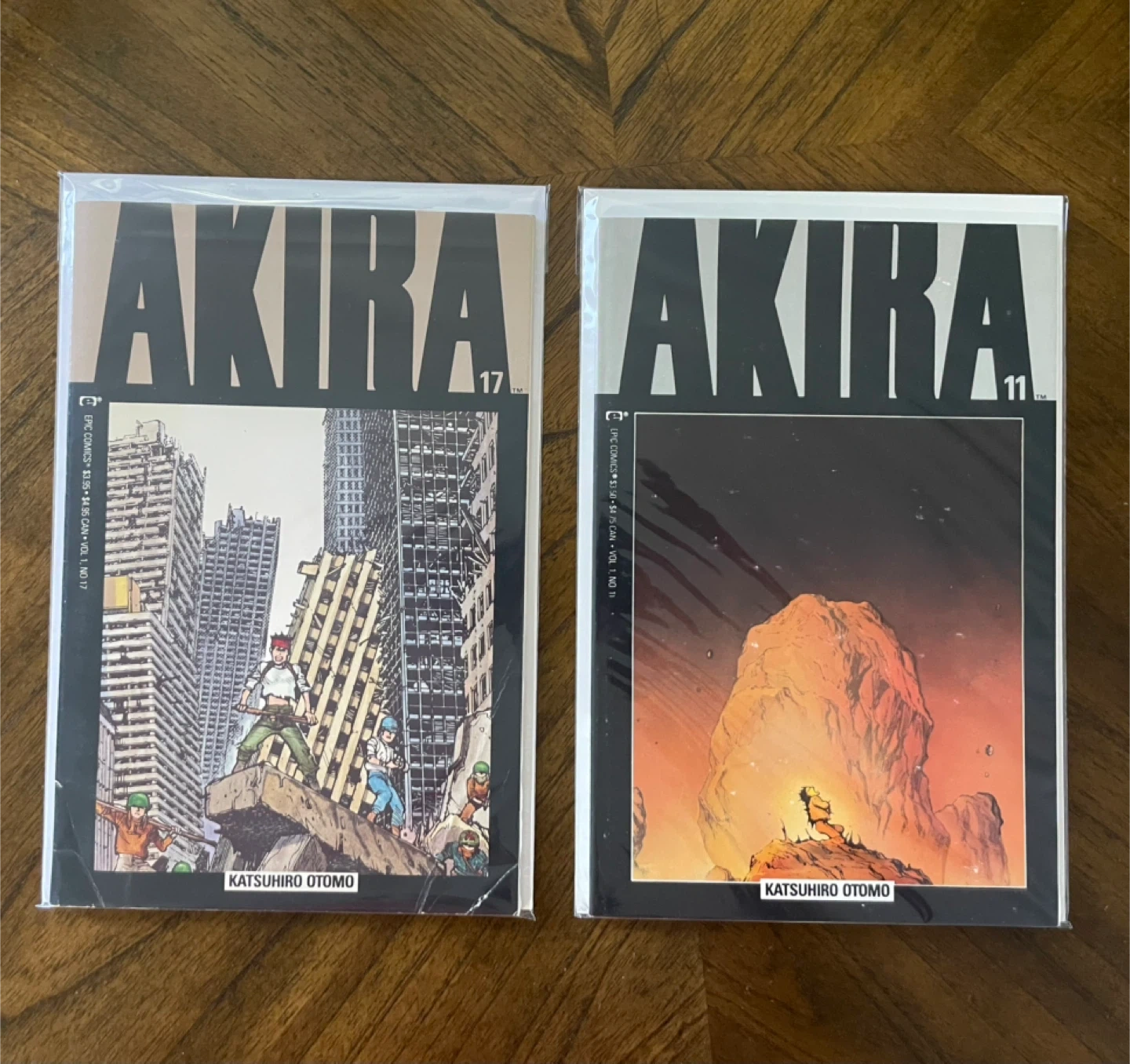 Two issues of the Akira manga by Katsuhiro Otomo, Vol. 11 and Vol. 17. Both are in protective sleeves. These comics are great for fans of cyberpunk and dystopian fiction.