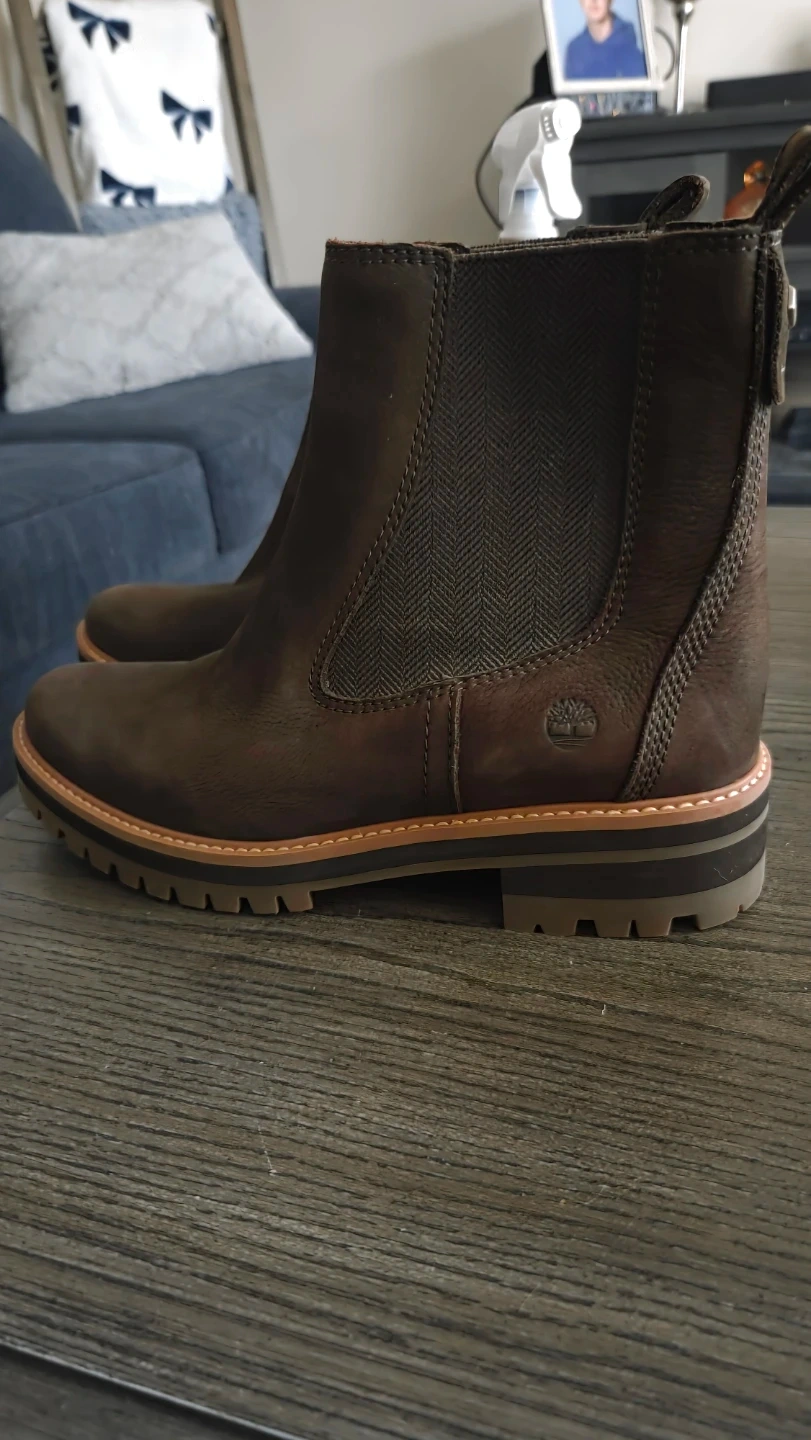 These Timberland Chelsea boots are crafted from dark brown leather with elastic side panels. They feature a lug sole for good traction. Perfect for everyday wear!