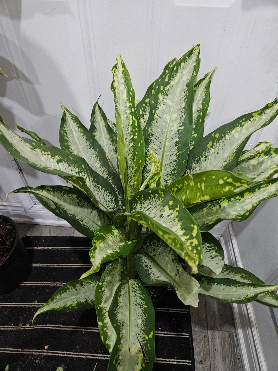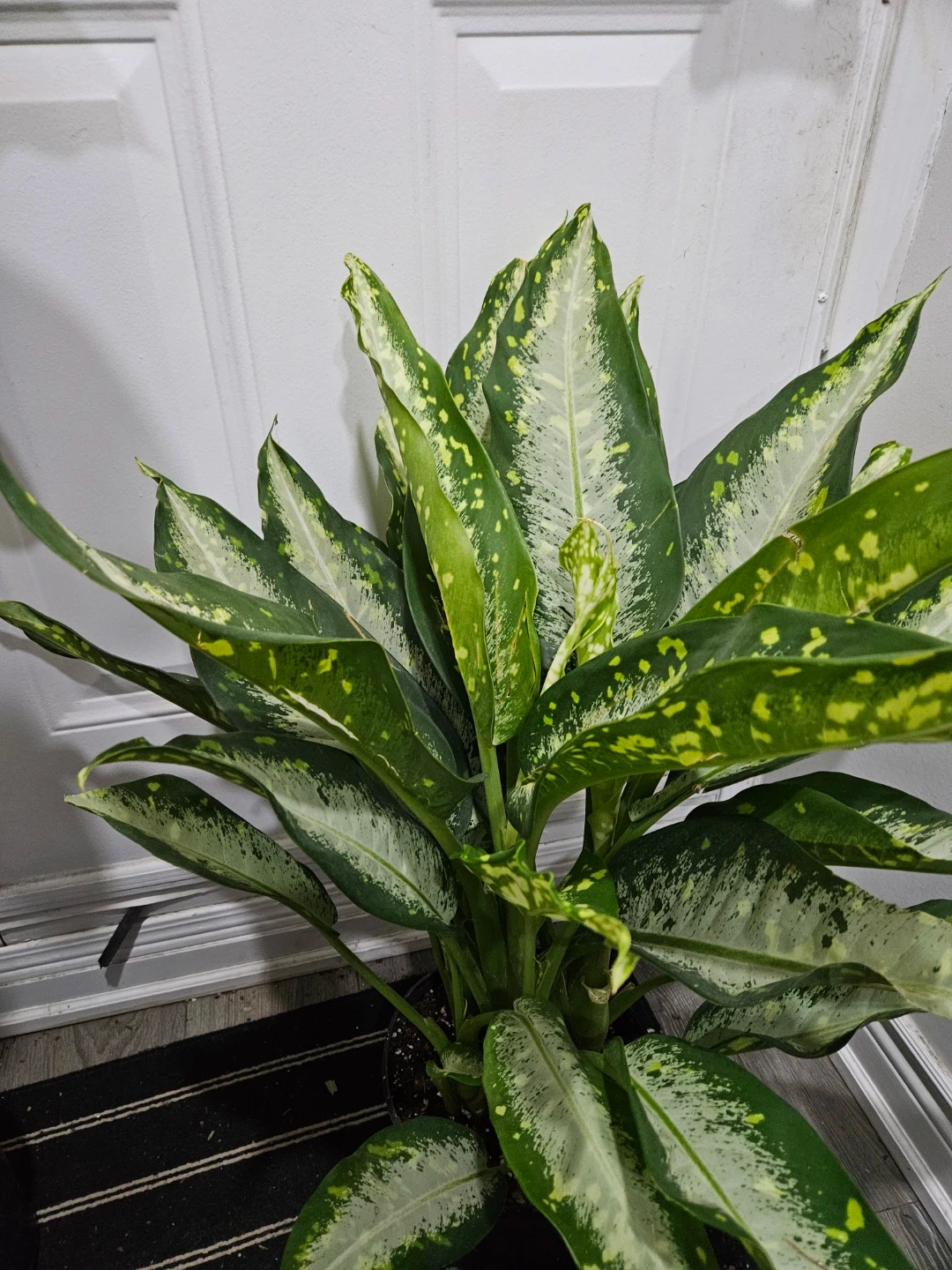 This Dieffenbachia Tropic Marianne plant features striking green and white variegated leaves. It's potted in a standard black plastic planter. This houseplant brightens up any indoor space with its lush foliage.