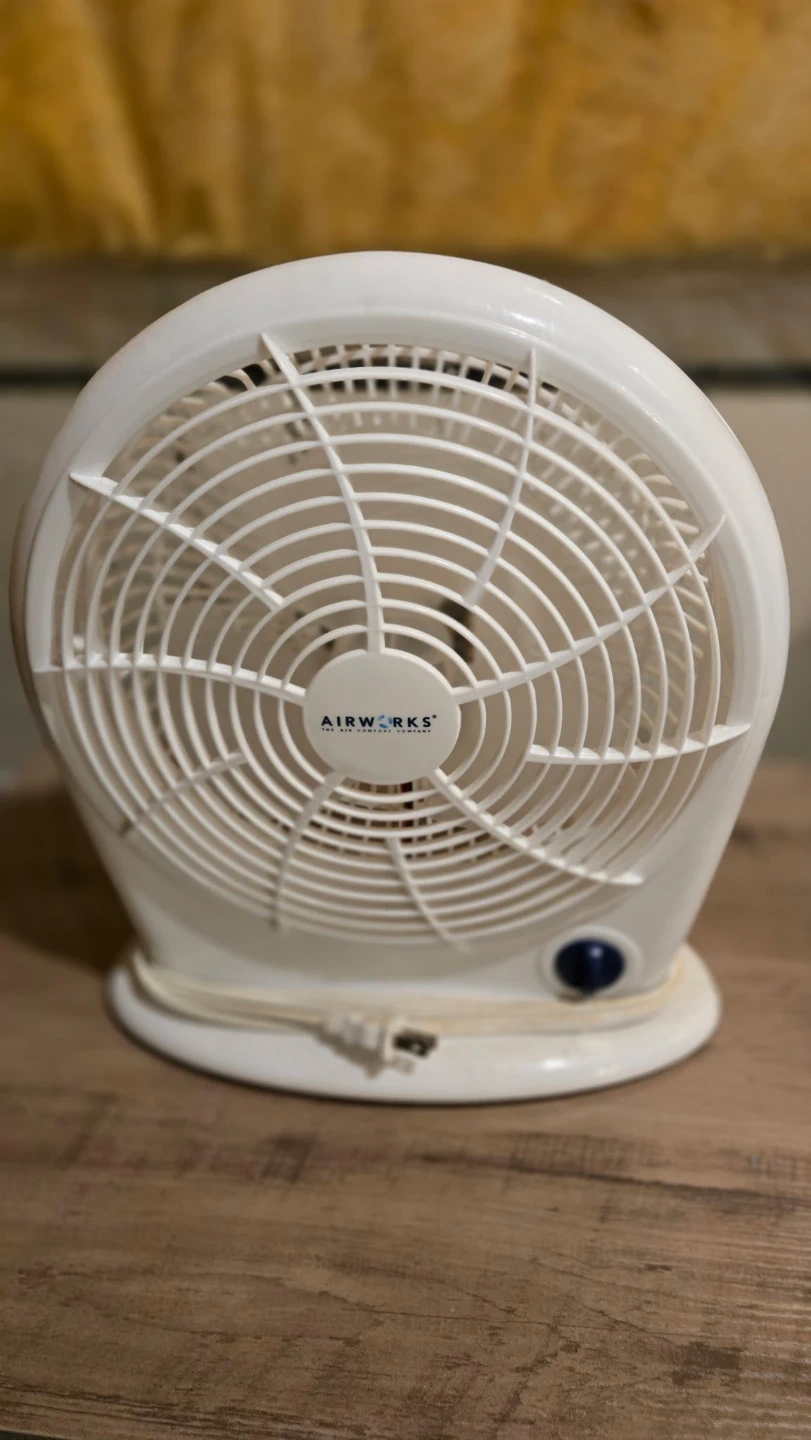 This is an Airworks white electric fan. It's a compact unit that provides airflow. It has a simple on/off button and a power cord.