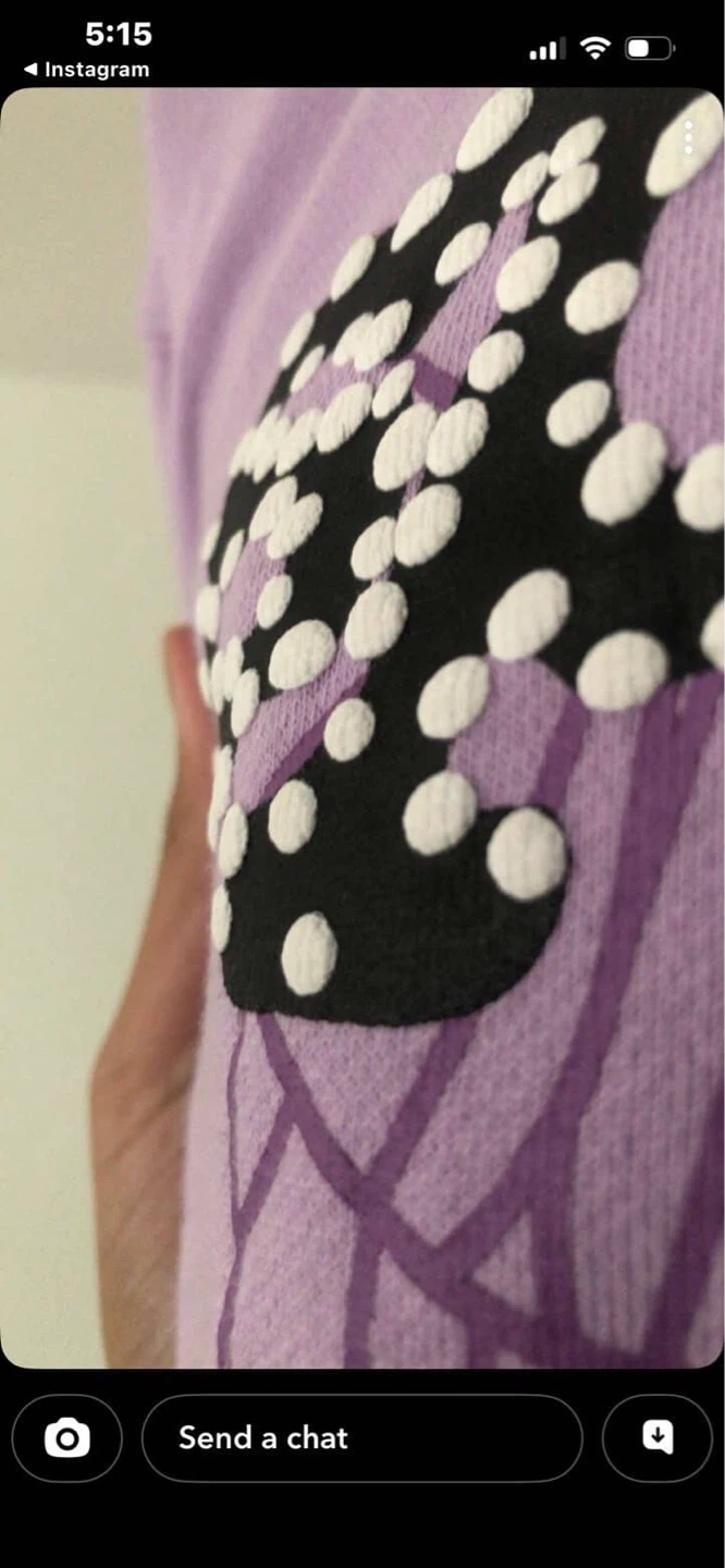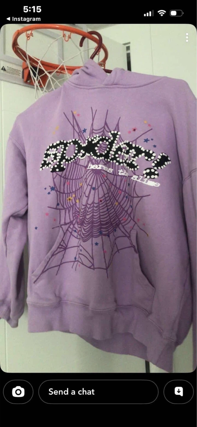 This is a purple Sp5der hoodie with a spiderweb graphic and speckles. It's made of a soft material and has a front pocket. This hoodie is perfect for casual wear. Interested in trades. OBO.