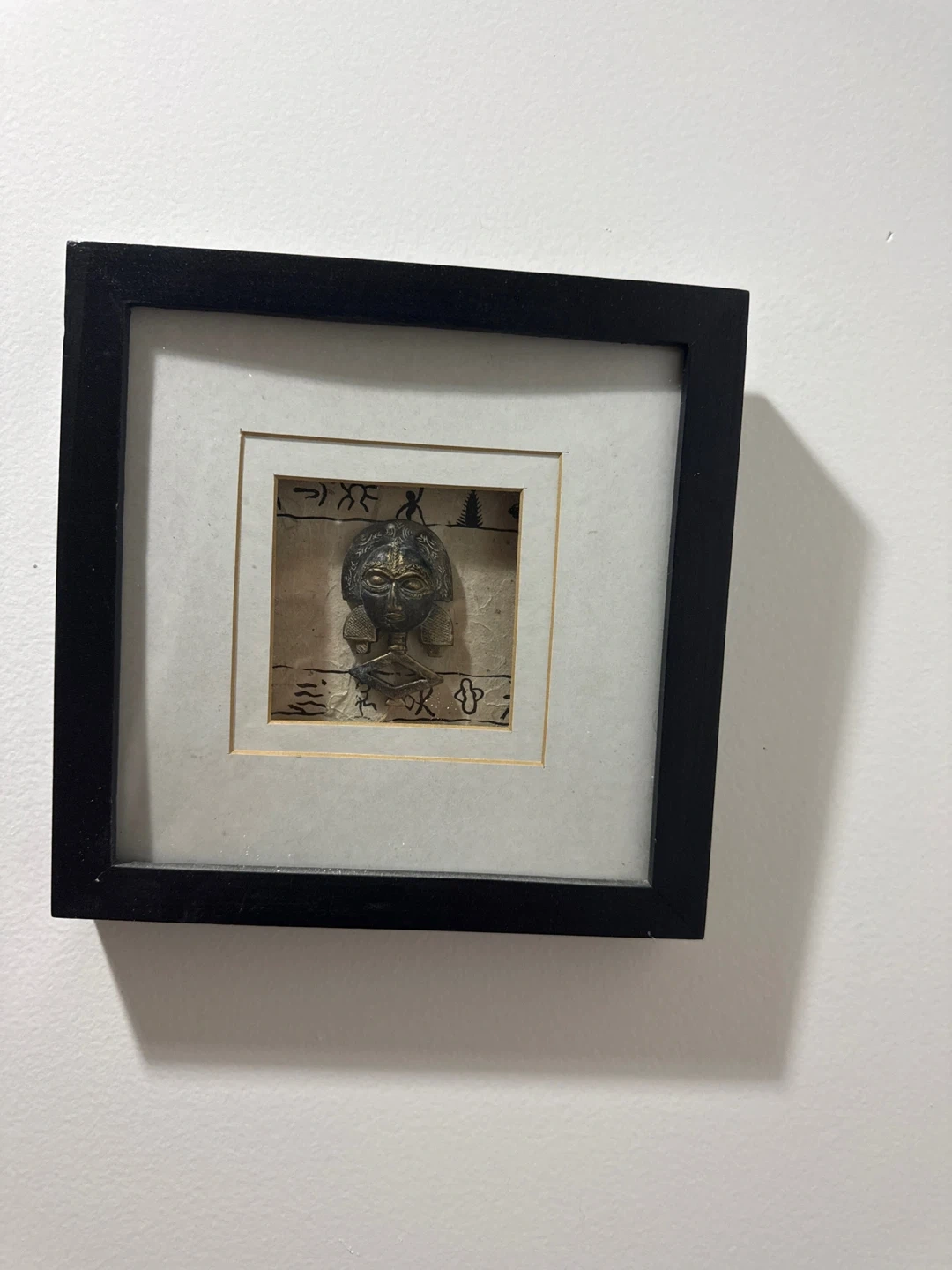 This framed piece features a detailed depiction inspired by ancient Egyptian art. It's framed in a black wood finish with a white mat. The artwork includes a central mask-like figure with hieroglyphic-style symbols in the background.
