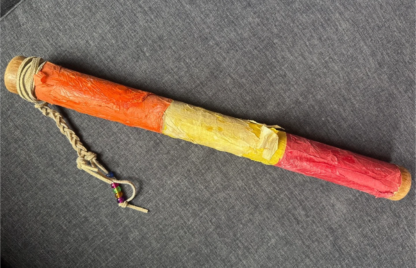 This is a handmade noise maker shaker with a braided rope and colourful beads attached. It's wrapped in textured paper in shades of orange, yellow, and red. It produces a shaking sound when moved.