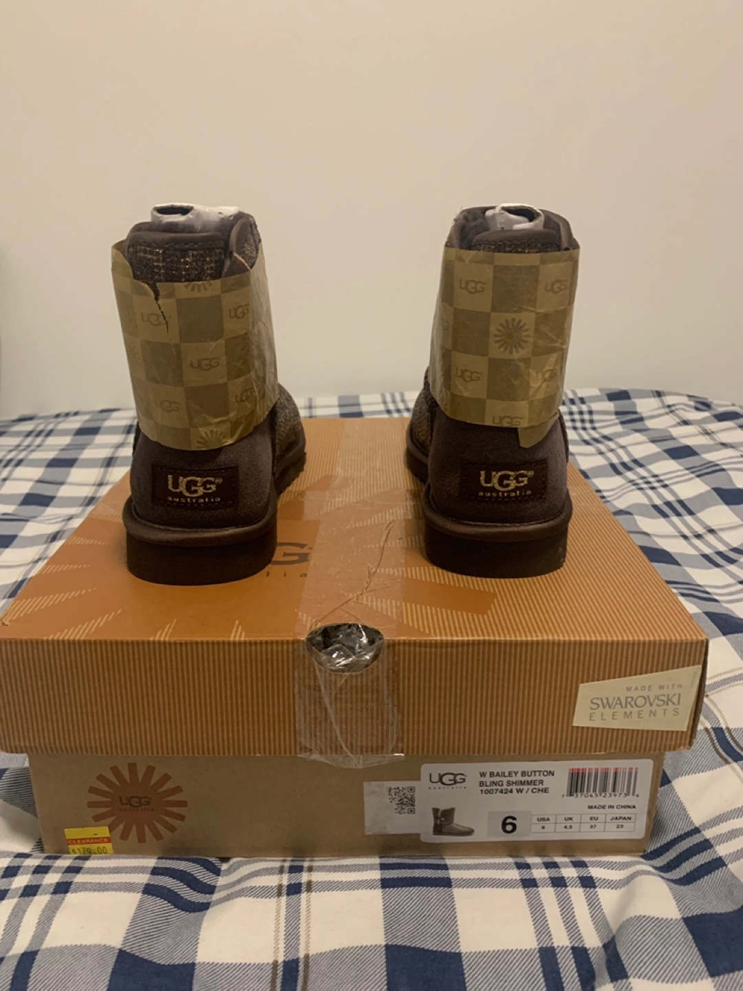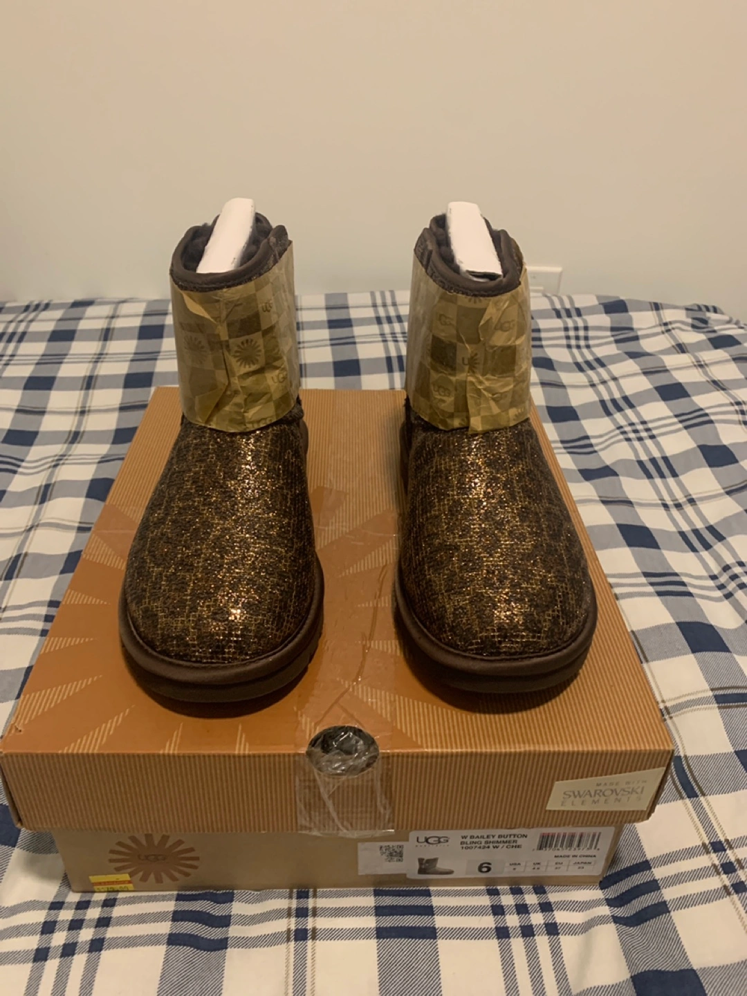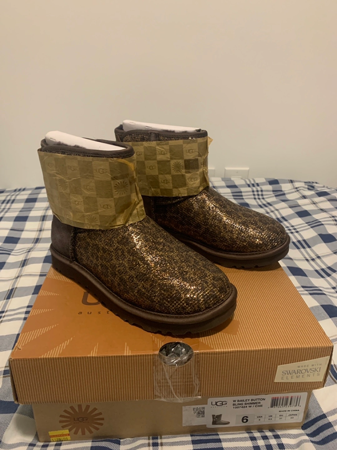Women's UGG Bailey Button boots. Size 6. Brown and gold bling shimmer. Made with Swarovski elements. New in box. Firm on price.