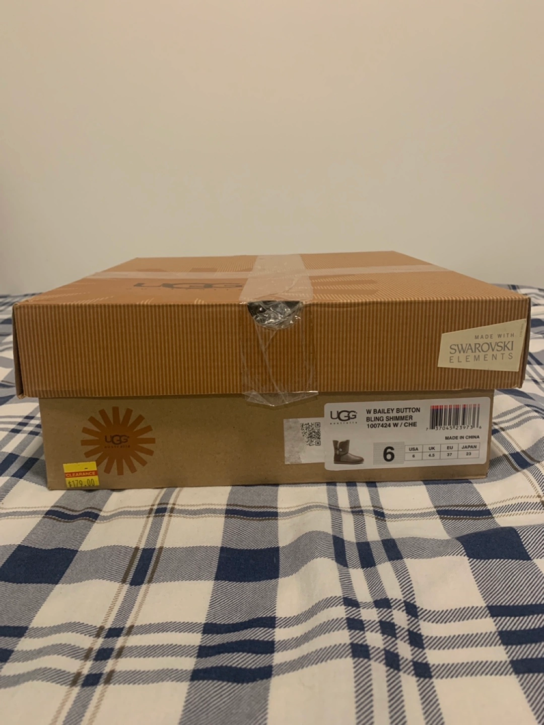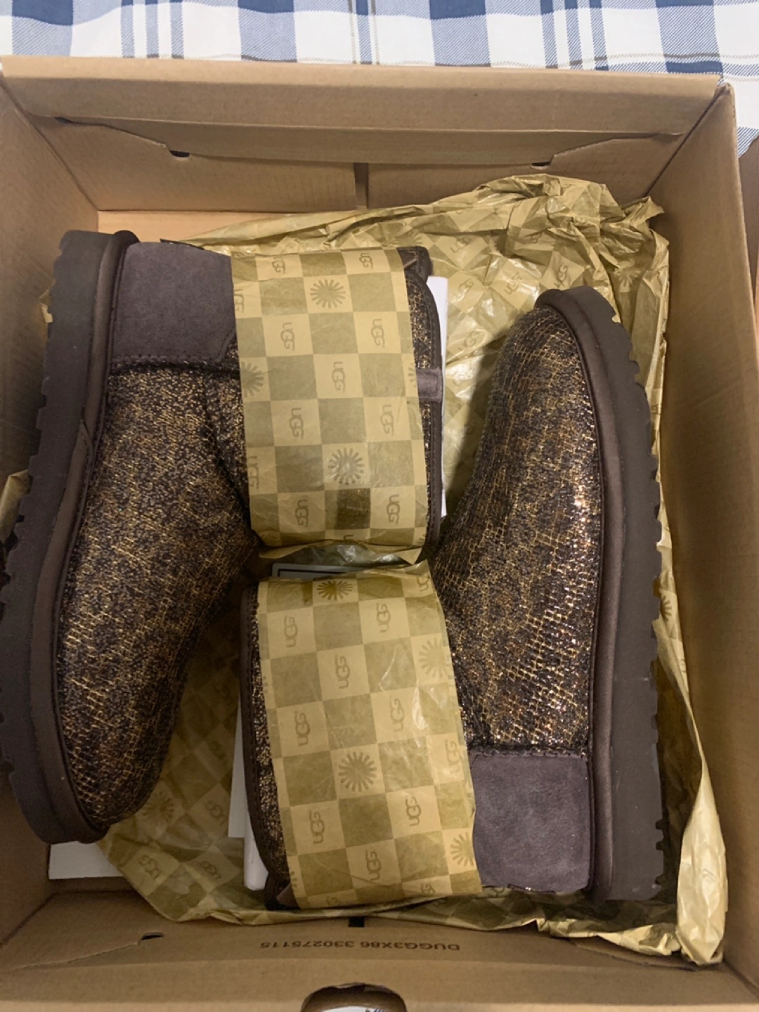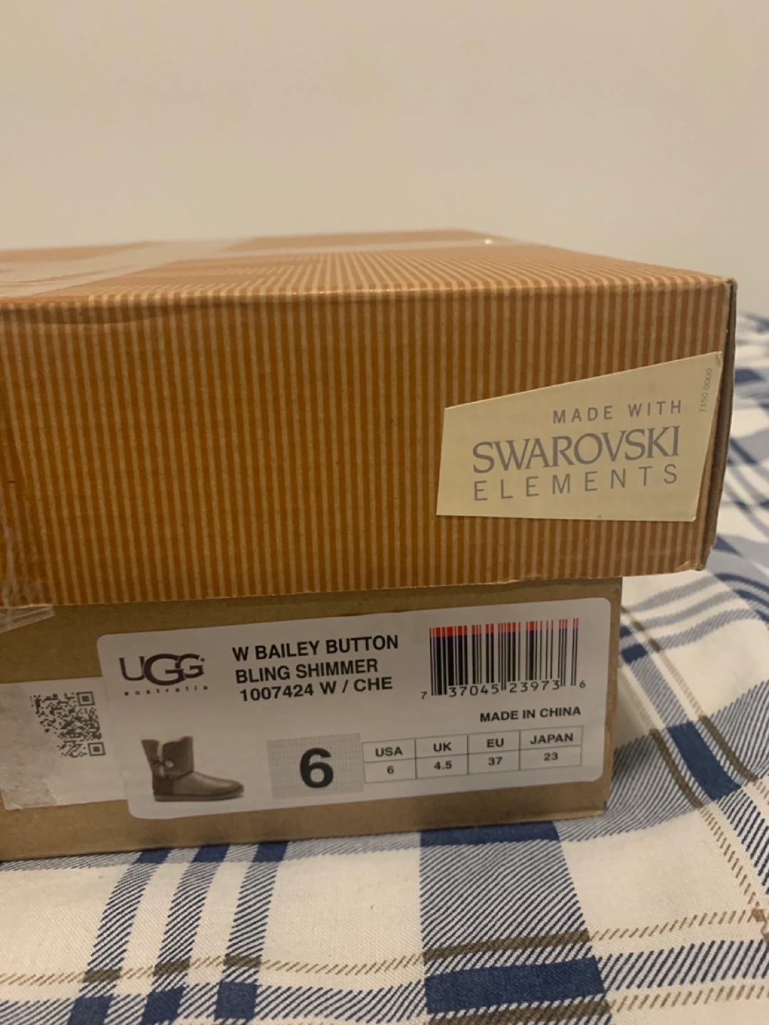 Women's UGG Bailey Button boots. Size 6. Brown and gold bling shimmer. Made with Swarovski elements. New in box. Firm on price.