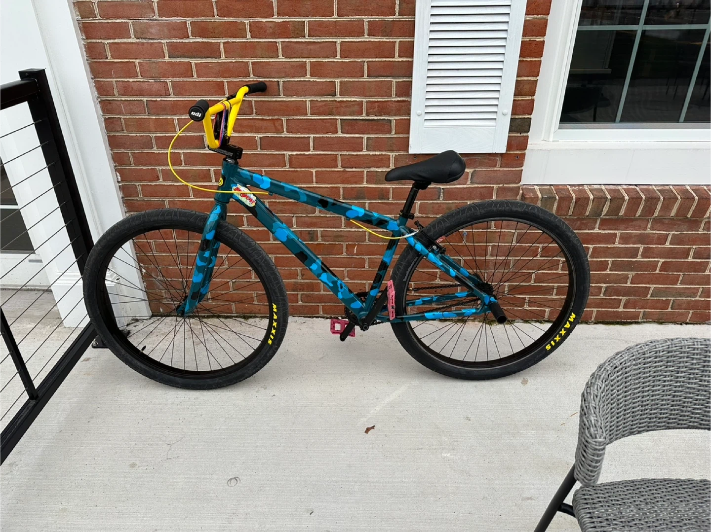 This SE Bikes big flyer is a 29" BMX bike in a cool blue camouflage pattern. It features yellow handlebars and pink pedals. The tires are Maxxis brand. This bike is built for performance and style!