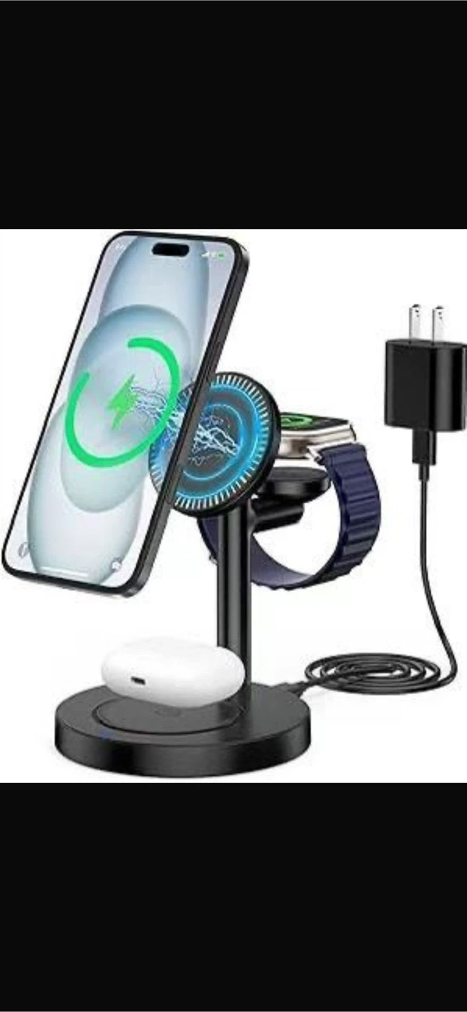 This is a 3-in-1 wireless charger stand in black. It can charge your phone, Apple Watch, and AirPods at the same time. It also comes with a charger.