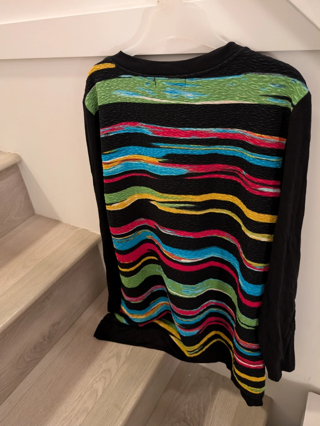 1. Long sleeve top features a vibrant, colourful star design on the front, accented with horizontal striped patterns in the front & back. It's made from a comfortable material and offers a unique, eye-catching look. Perfect for adding a pop of colour to your casual outfits! Size L $5