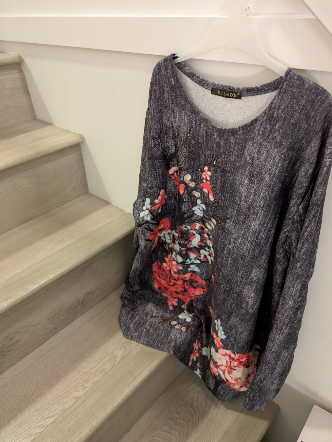 2. Grey long sleeve w/orangey flowers in the front & back - Size L $5