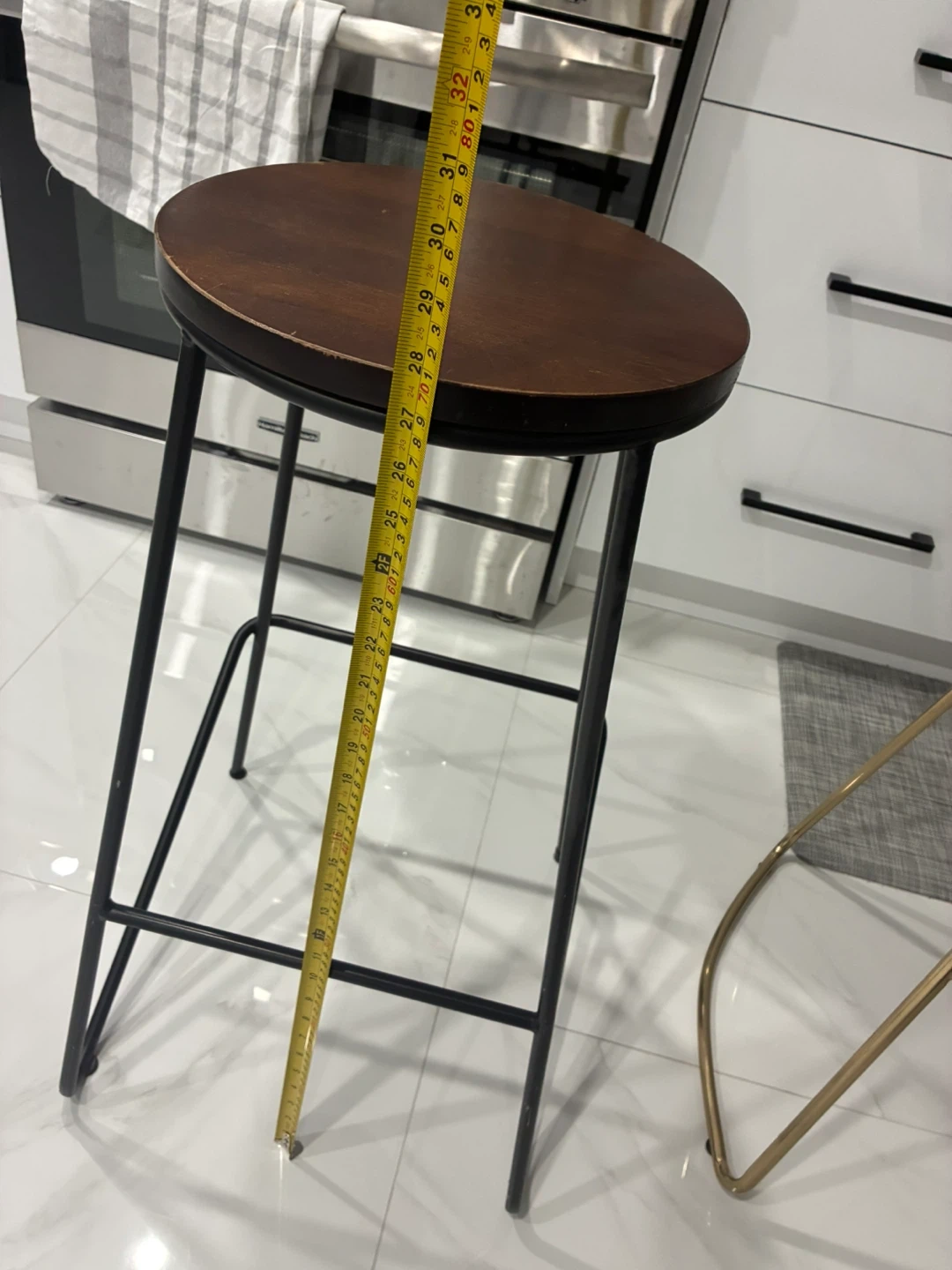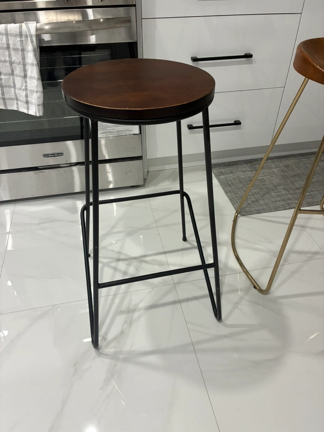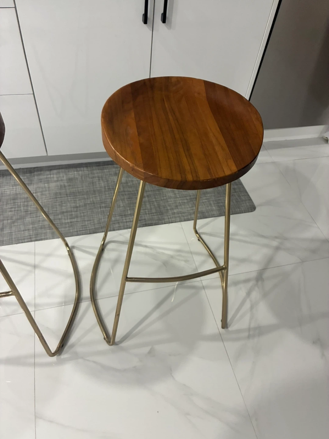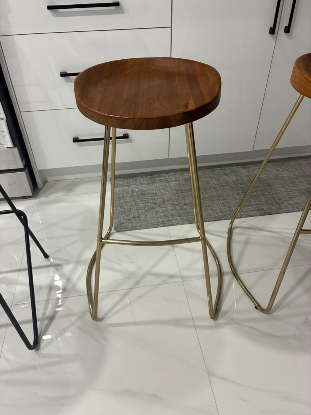 Set of two bar stools featuring round wooden seats and metal frames. One stool has a black frame and the other has a gold-toned frame. Seat diameter is approximately 13 inches, and the height measures around 28 inches.