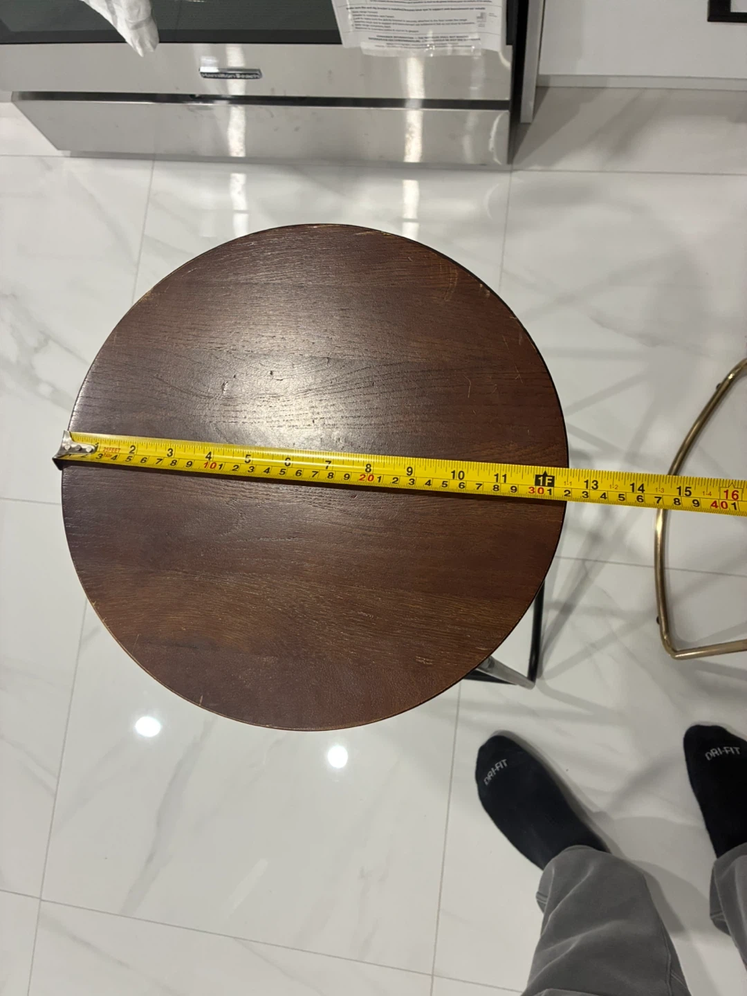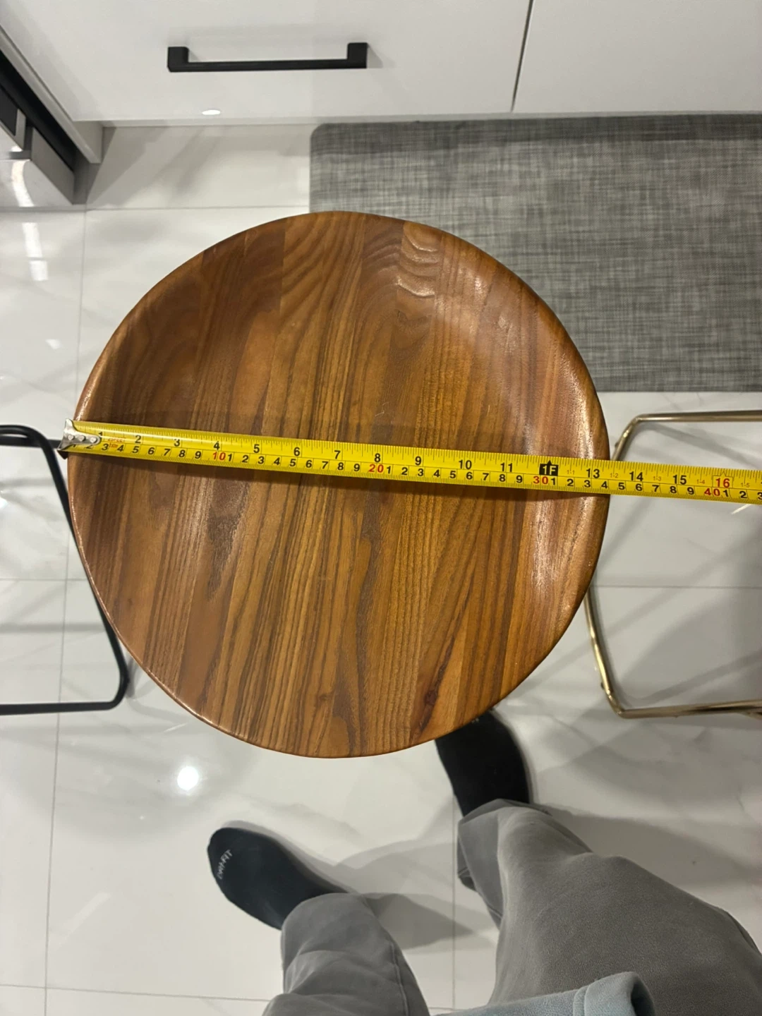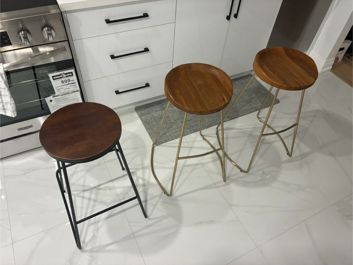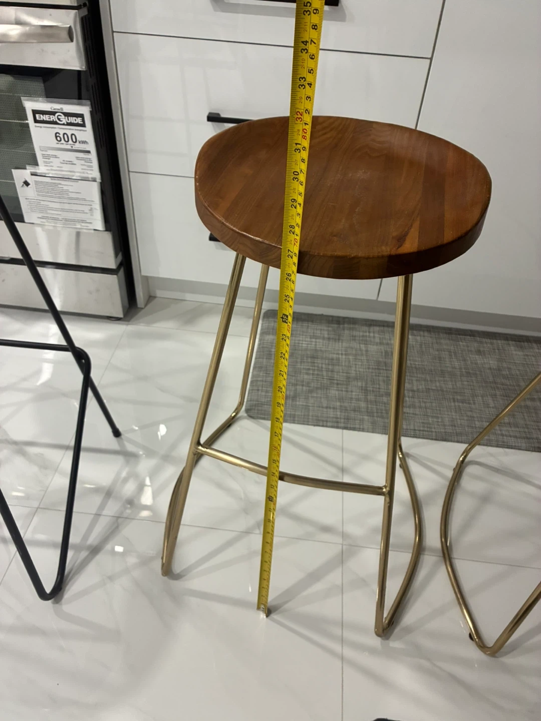 Set of two bar stools featuring round wooden seats and metal frames. One stool has a black frame and the other has a gold-toned frame. Seat diameter is approximately 13 inches, and the height measures around 28 inches.