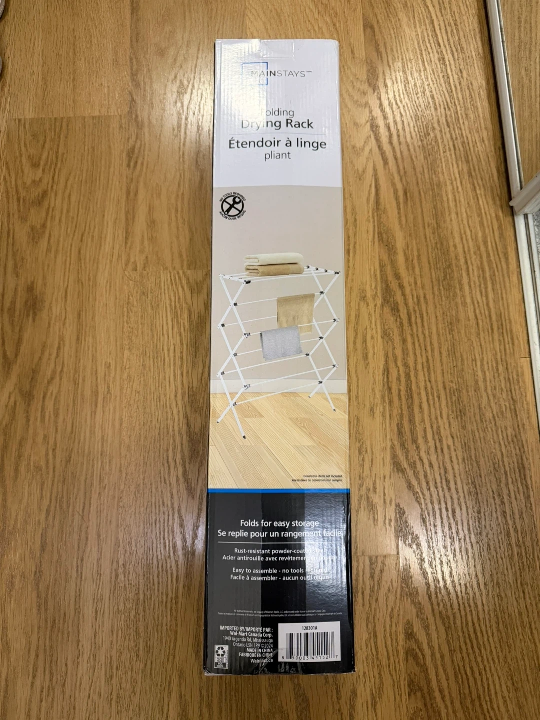 This is a Mainstays folding drying rack, perfect for laundry day. It's made with rust-resistant powder-coated steel for durability. Folds flat for easy storage when not in use!