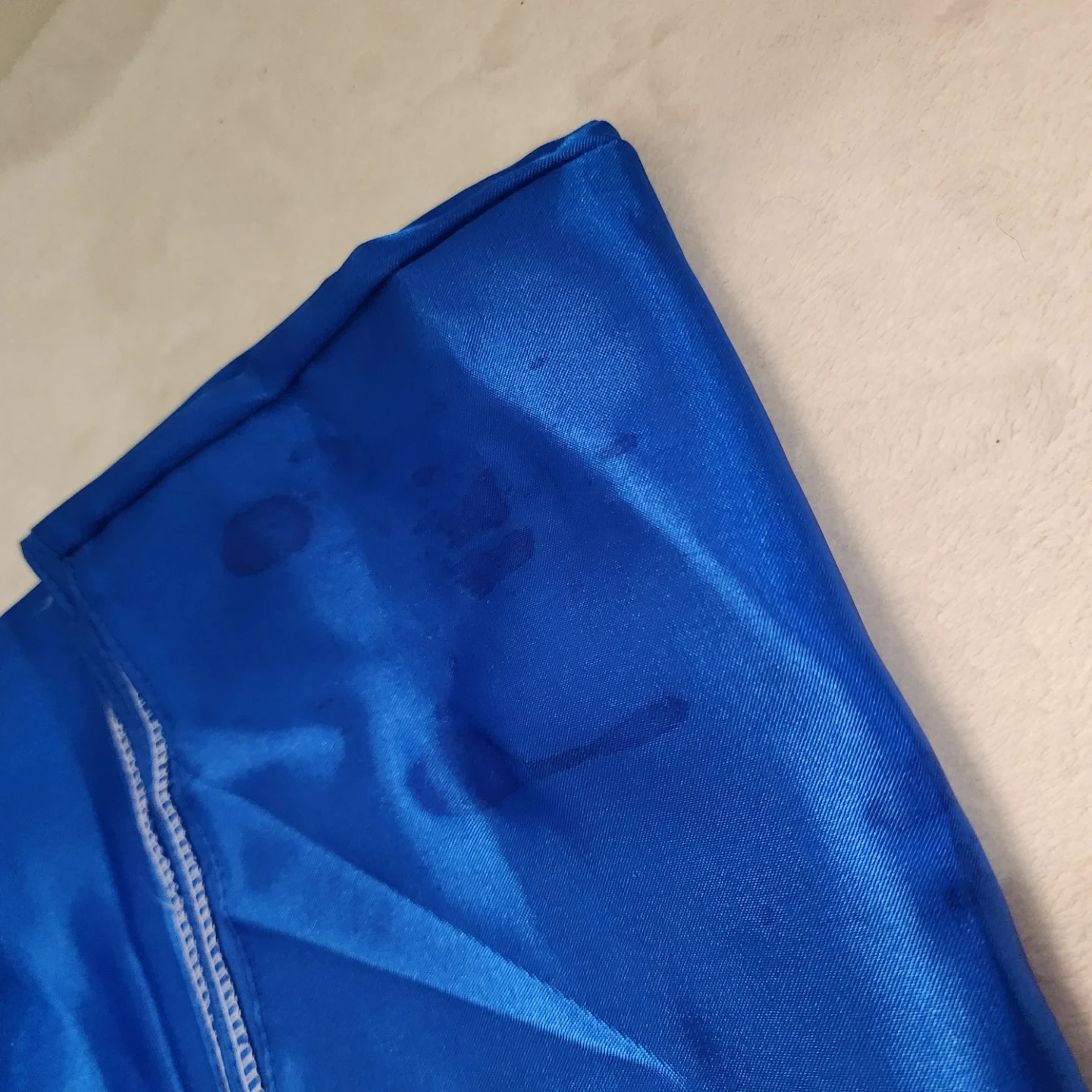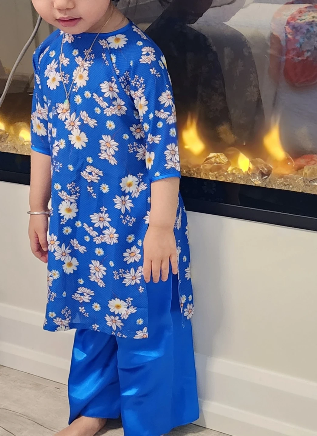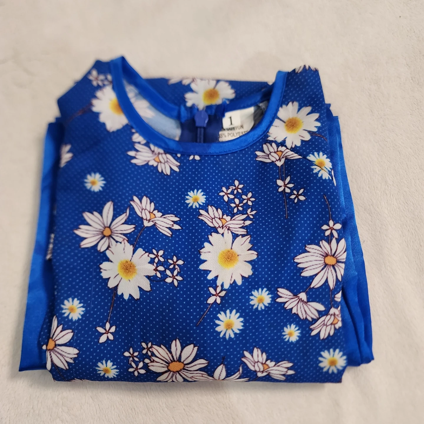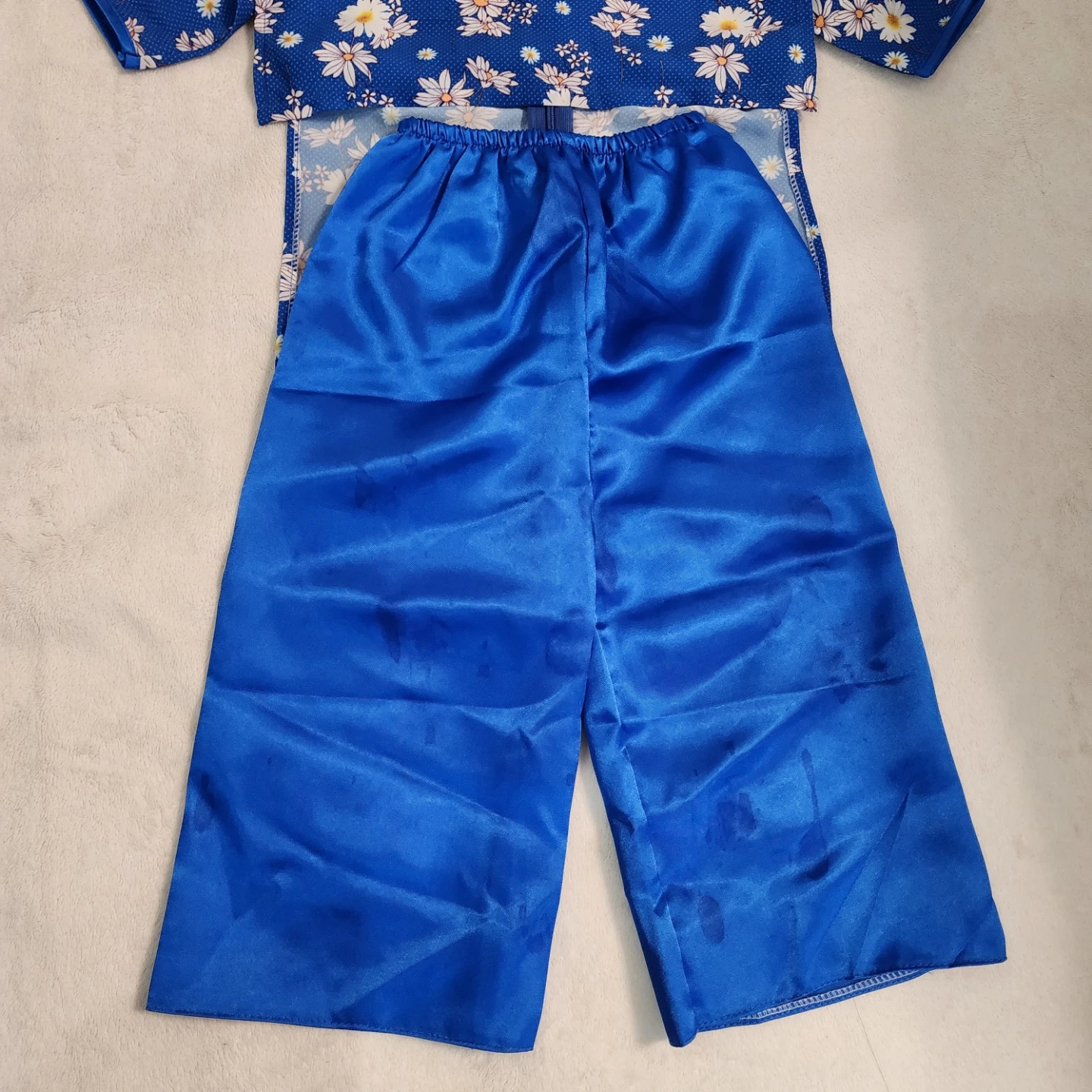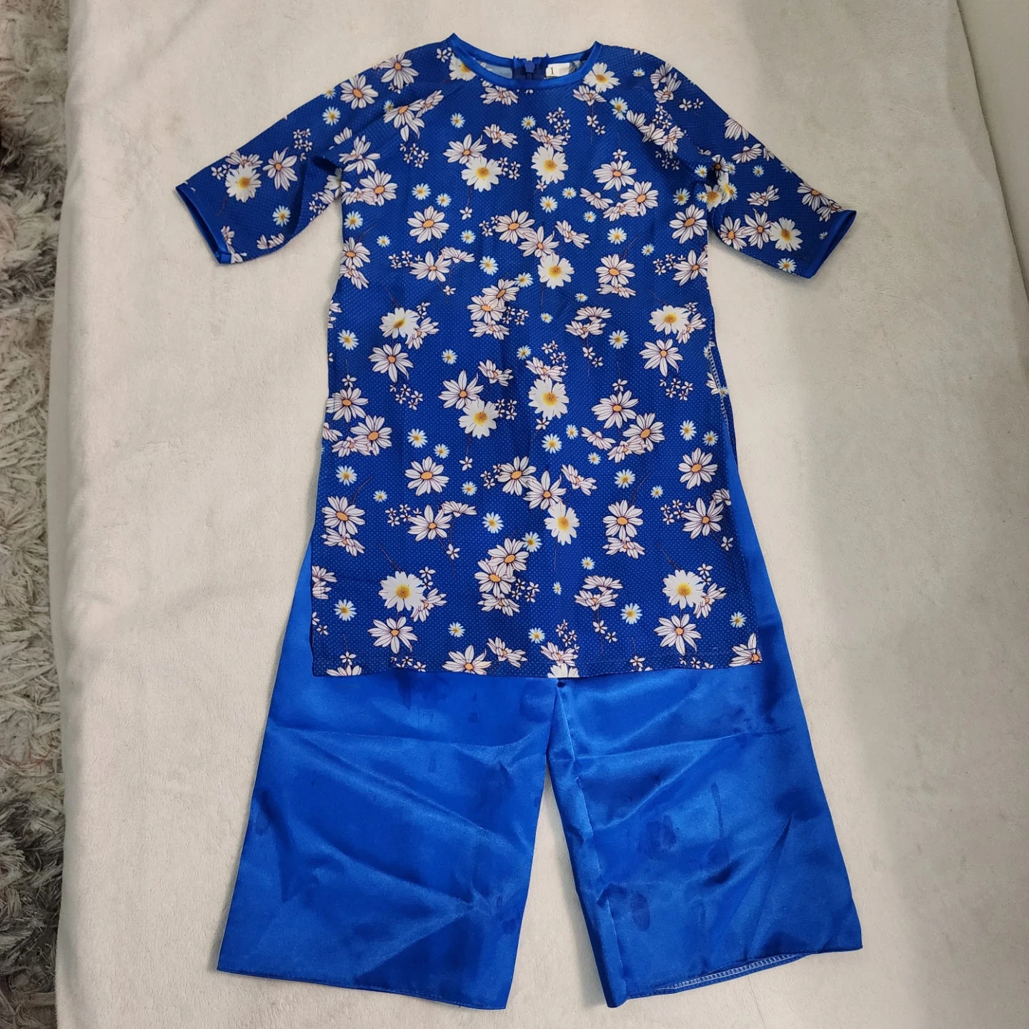 This cute blue Vietnamese AO Dai set features a white daisy print. It's made of 90% polyester. The pants had stains noticed upon taking pictures but can be washed. Only worn once