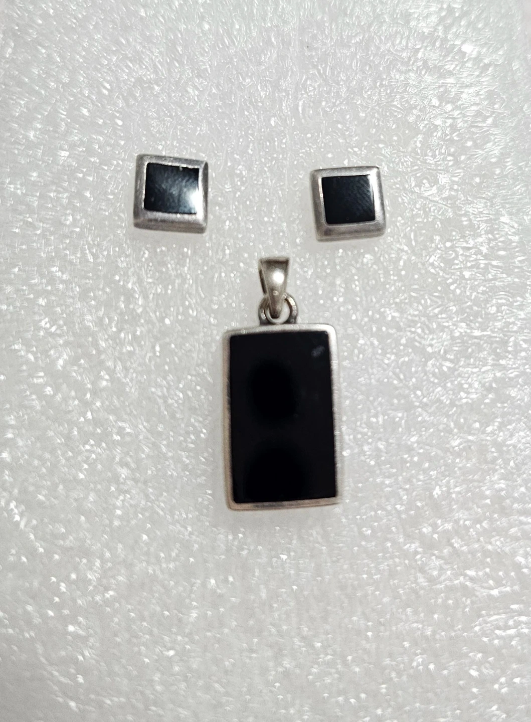 This is a lovely set featuring a rectangular pendant and a pair of square stud earrings. They're a classic combination that's sure to complement many outfits!
