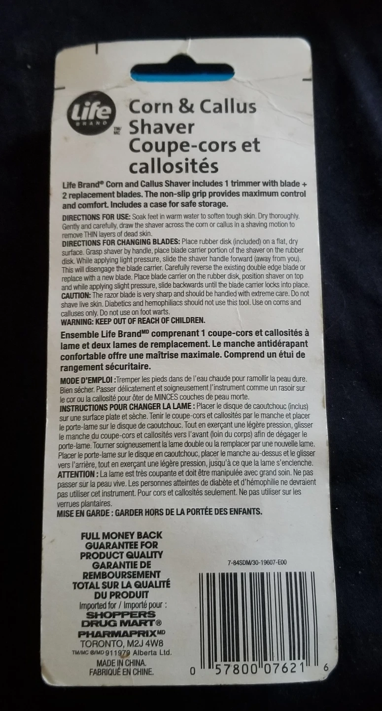 This Life Brand Corn & Callus Shaver includes 1 trimmer with blade and 2 replacement blades. It features a non-slip grip for comfort and control. Eliminates calluses and corns. Blades are sharp, so use with caution.