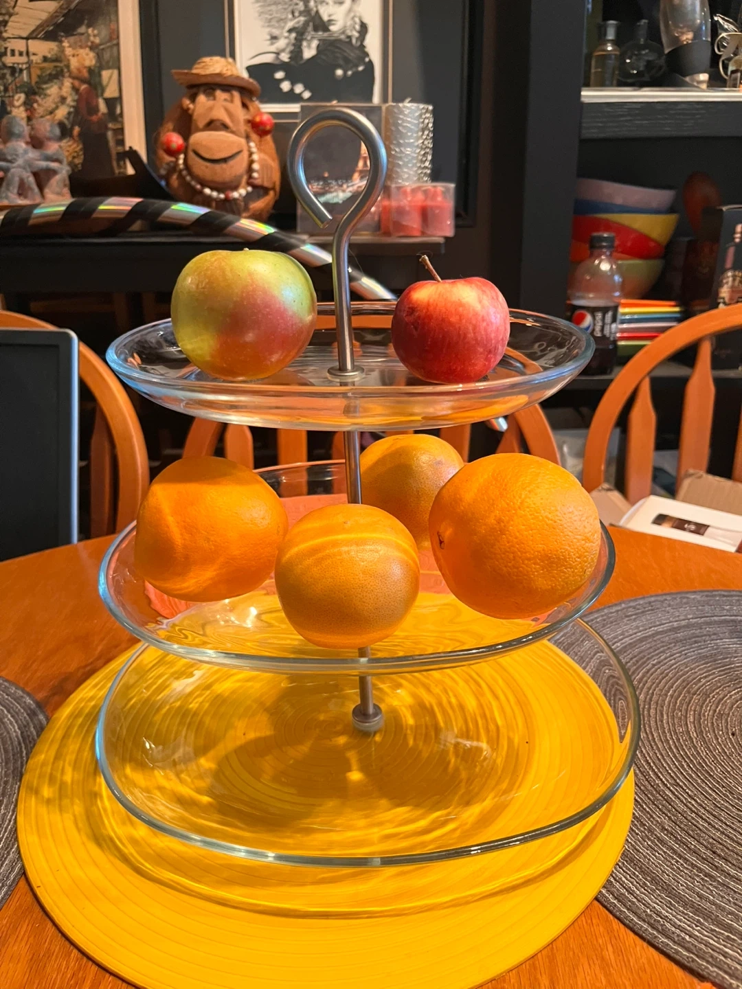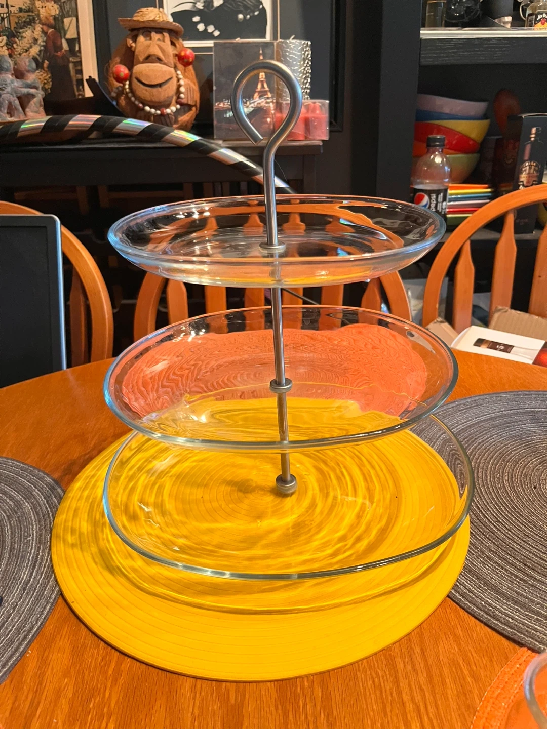This is a three-tier glass serving stand. It's made of clear glass and features a metal central support rod. Perfect for displaying desserts, appetizers, or fruit!