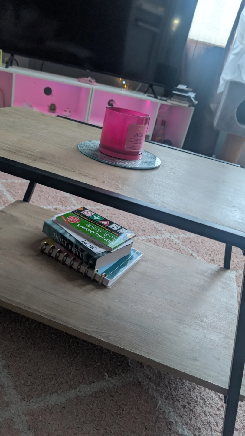 This coffee table features a light wood grain laminate top and shelf with a black metal frame. It's spacious enough for your living room essentials. The shelf offers extra storage for books or decor.