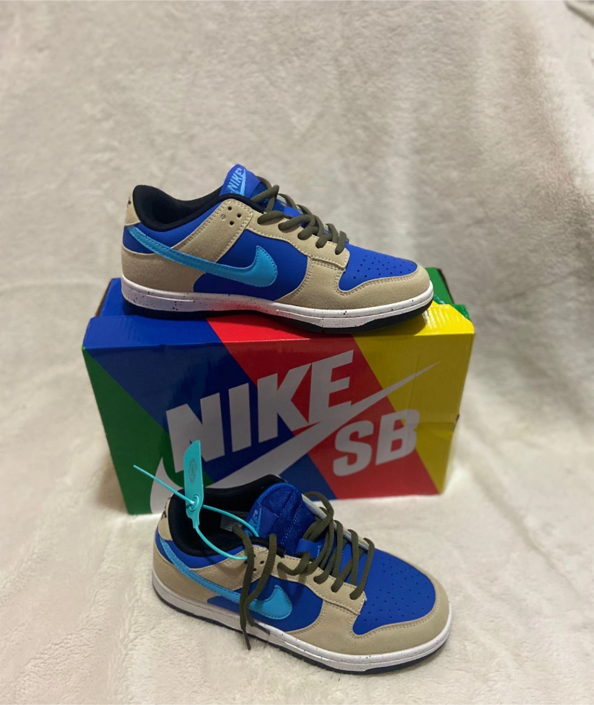 Selling a pair of Nike SB Dunk Low sneakers in a cool blue and tan colorway! They come with the original box. Perfect for skating or just adding a pop of color to your outfit