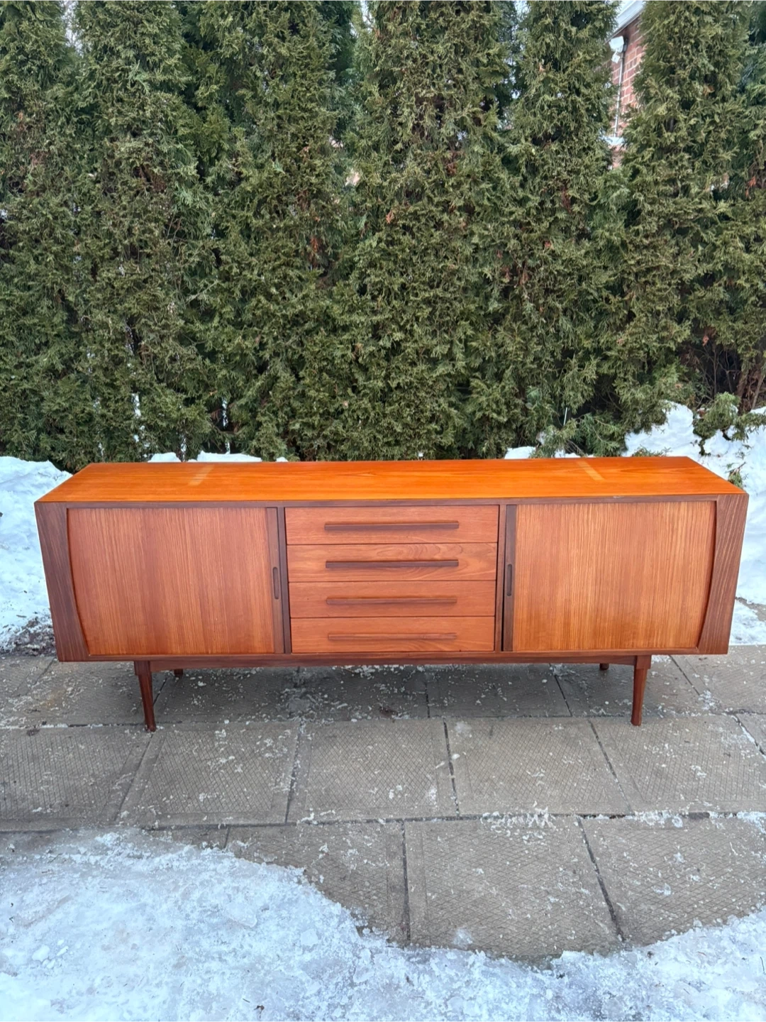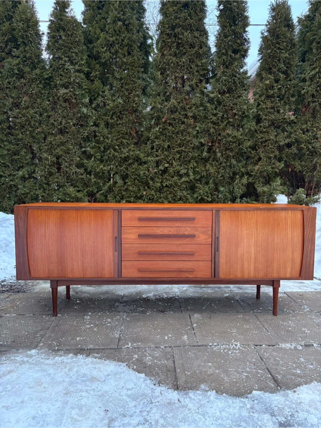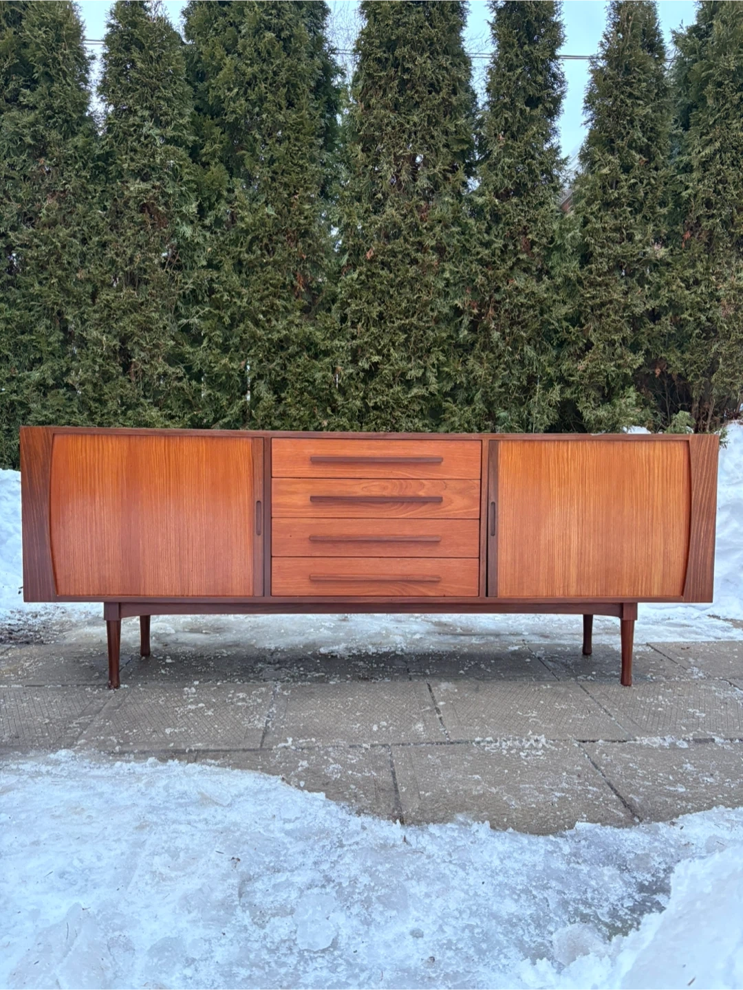 Selling a Mid-Century Modern Teak Credenza by RS Associates with rich teak grain, clean lines, and tapered legs. Features 4 drawers and 2 sliding tambour doors for plenty of storage. Perfect as a sideboard, media console, or statement piece. Matching hutch also available.