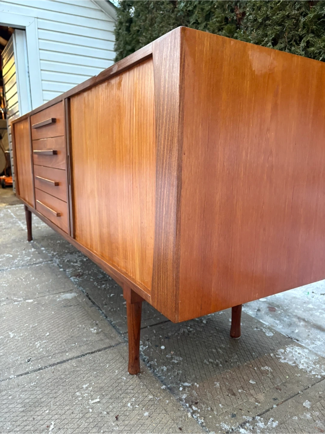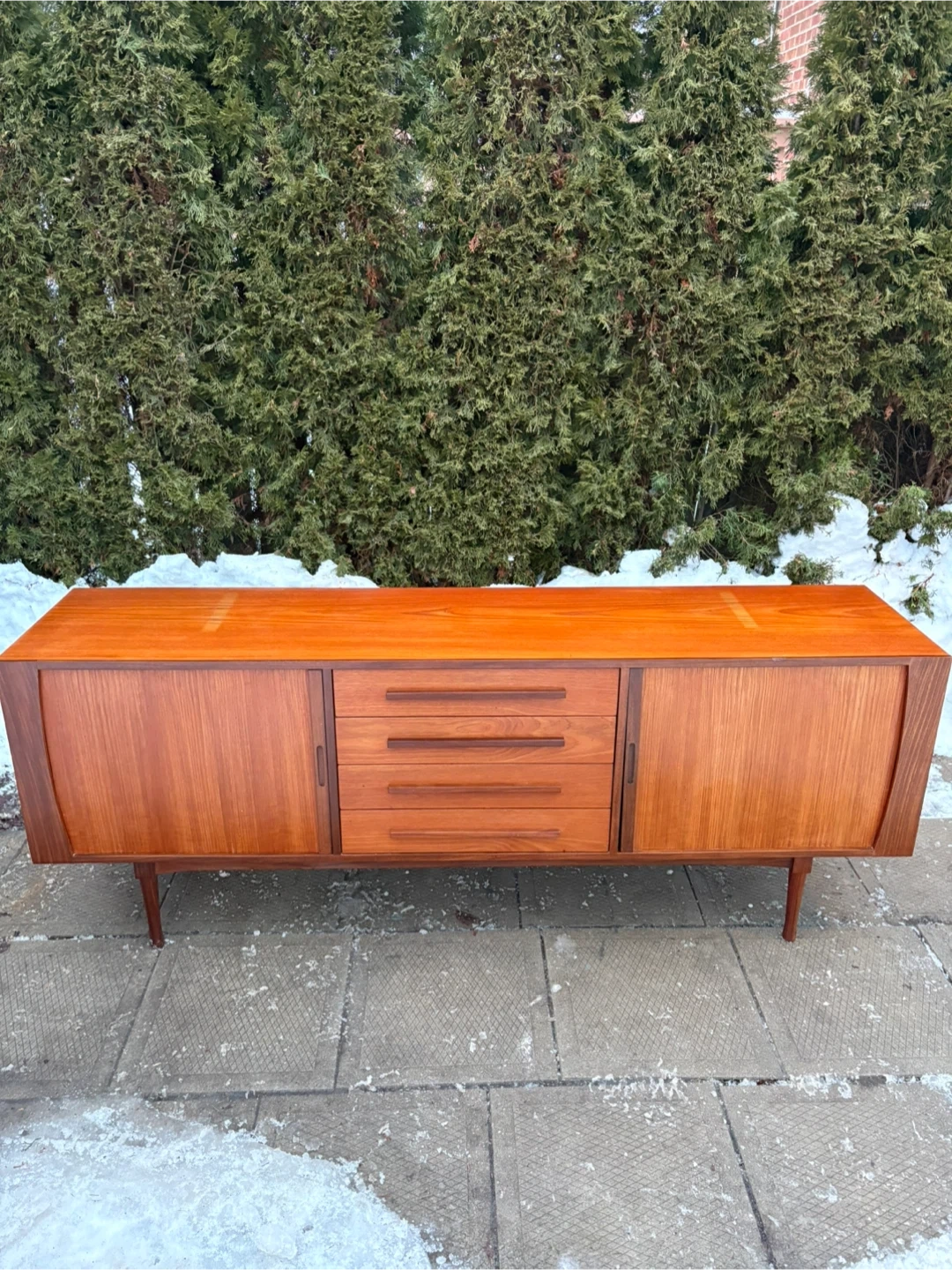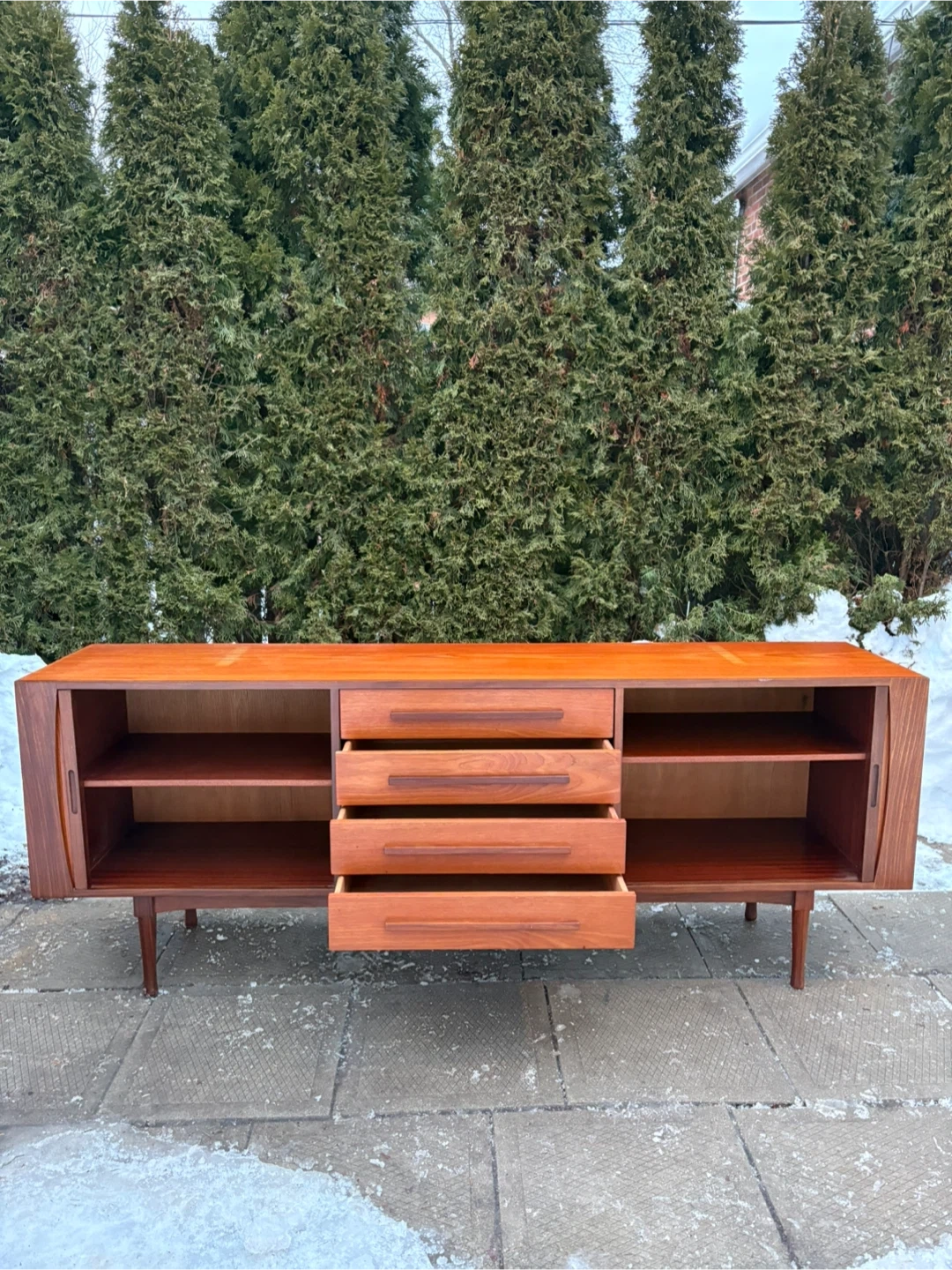 Selling a Mid-Century Modern Teak Credenza by RS Associates with rich teak grain, clean lines, and tapered legs. Features 4 drawers and 2 sliding tambour doors for plenty of storage. Perfect as a sideboard, media console, or statement piece. Matching hutch also available.