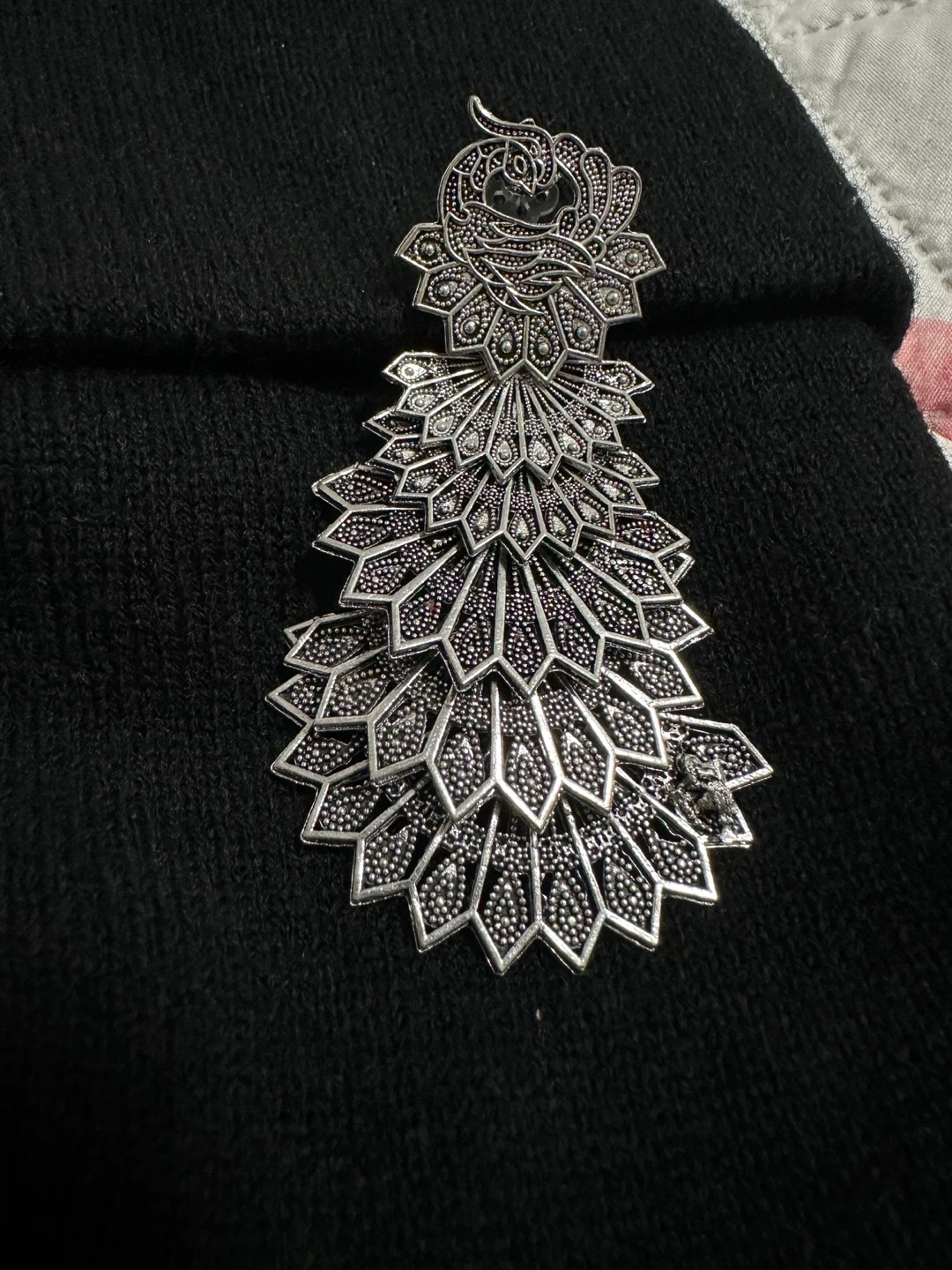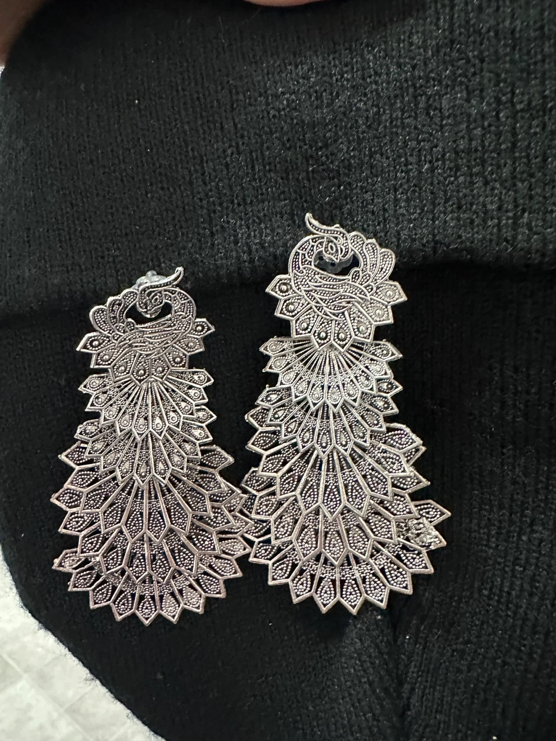 Gorgeous silver-toned dangle earrings designed with a peacock feather motif. These statement earrings are intricate and eye-catching. They're perfect for adding a touch of elegance to any outfit!