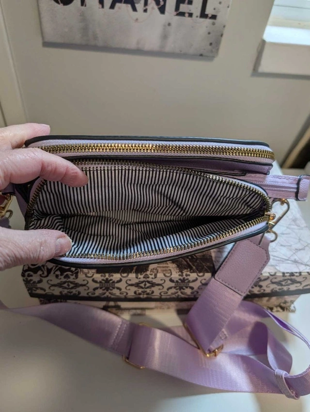Super cute and Mauve handbag. It's got a great strap which can be worn as a shoulder bag or crossbody, and it's adjustable. This bag has three top zippered pockets, and the lining is a cute, crisp looking blue and white pinstripe which makes it easy to find all your things. Pick up area Grantham Ave and Carlton Street. From a very clean smoke-free home. Please see my other ads, thank you.