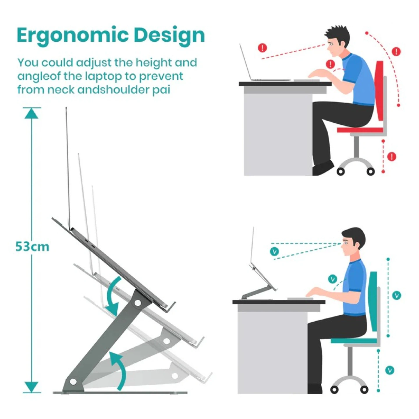 - ERGONOMIC DESIGN: You can adjust the height and angle of the laptop to prevent neck and shoulder pain.