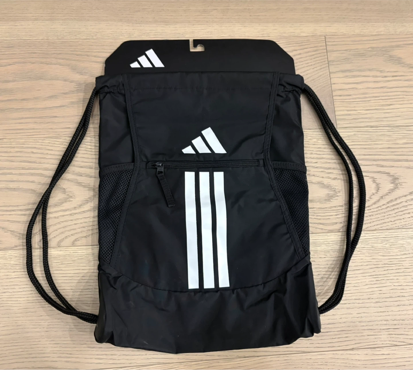 Selling a black Adidas drawstring backpack! It features the classic three-stripe design, a zippered front pocket and mesh slip-pockets for water bottles. Perfect for carrying your gym clothes or everyday essentials.