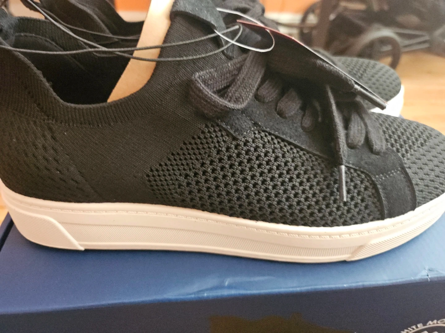 White Mountain women's lace up sneakers in black. These shoes are a size 10 and feature a knit upper with a contrasting white sole. Brand new with tags attached!